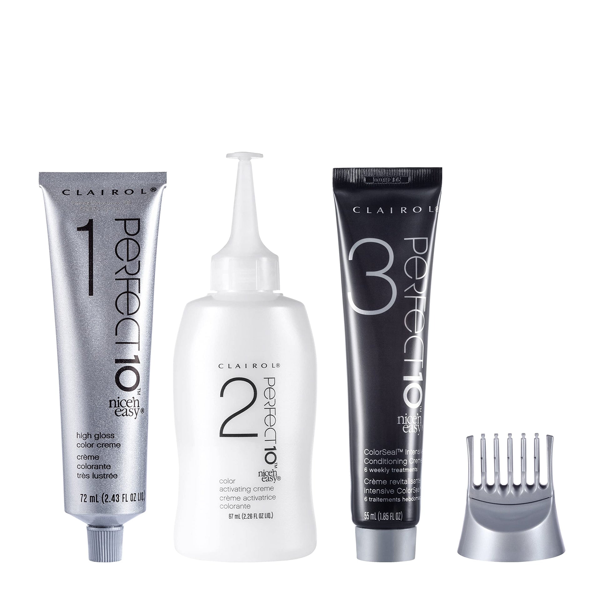Details: Experience perfection with the Clairol Nice N' Easy Perfect 10 Permanent Hair Dye Kit. This complete kit comes with high gloss color cream, color blend activator, color seal conditioner, and expert gloves, making it Nice N' Easy to give your hair the color boost of your dreams. All you need is 10 quick minutes to get luscious color and gloss with the perfect balance of lightness, darkness, and tone. This salon-inspired dye is formulated to be gentle on your hair and scalp, and best of all, it provides natural-looking coverage for up to 60 head-turning days.
