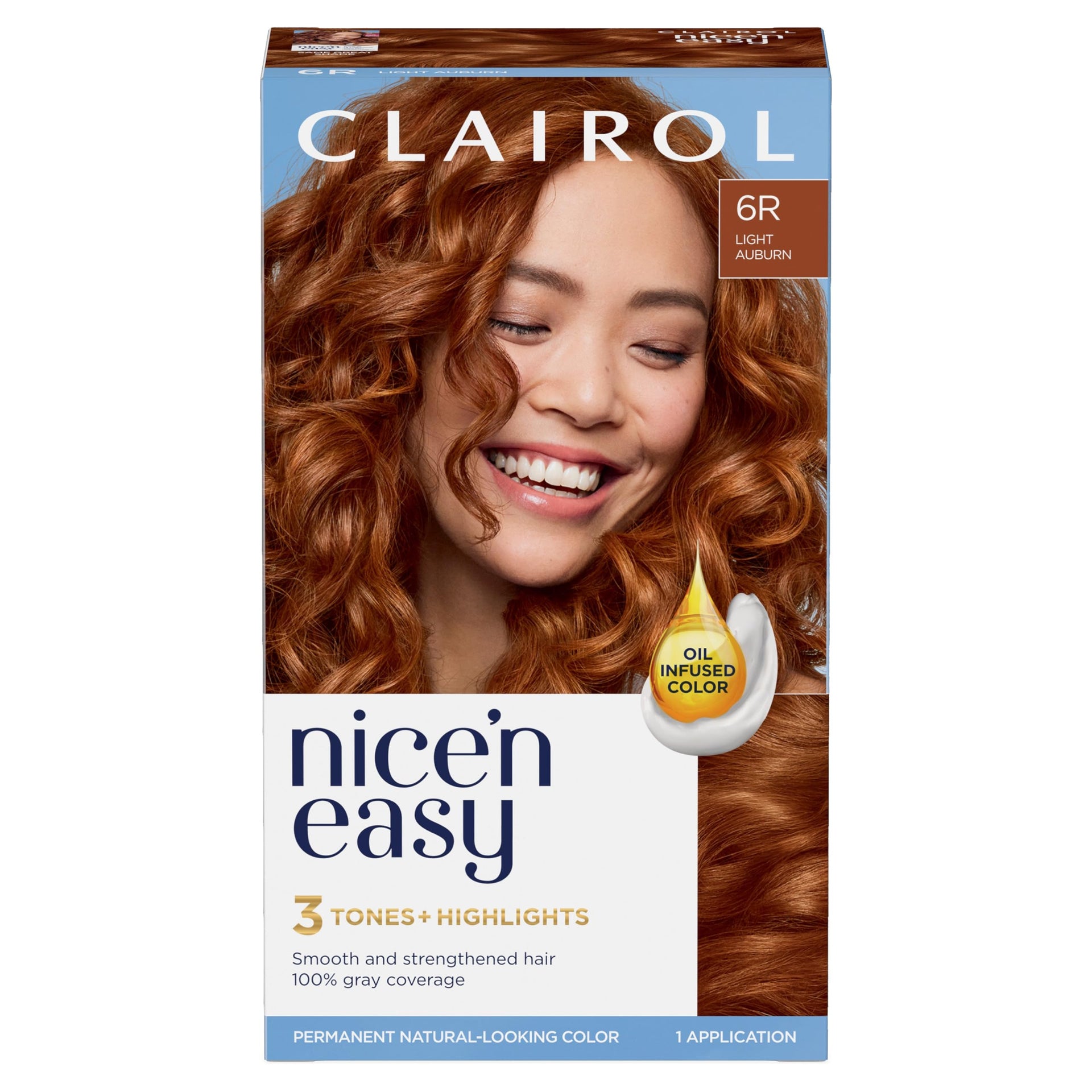 Details: The Secret to Natural Looking Color? Clairol Nice'n Easy covers your grays with multi-dimensional natural looking color. 3 tones + highlights mimic your natural hair color's highs and lows. Oil infused formula smooths your hair so it takes color in fully and left with added smoothness. Revitashine Intense Treatment helps strengthen hair bonds and seal color in. Enjoy up to 8 weeks of shiny color. It's so me!