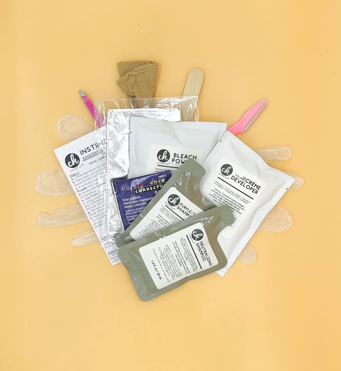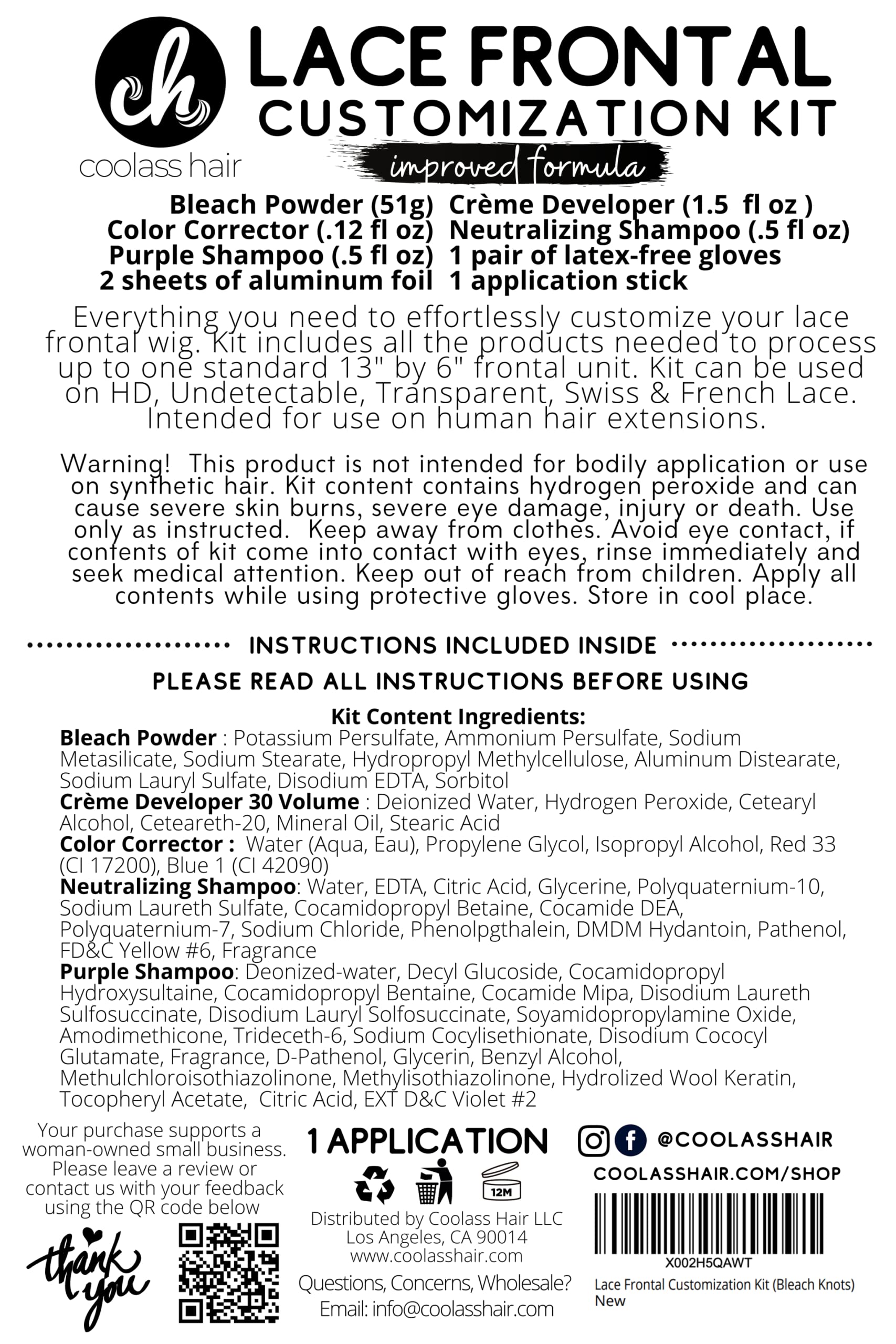 Details: Everything you need to effortlessly customize your lace closure wig. Kit includes all the products needed to process up to a 15" by 5" (inch) frontal unit. Kit can be used on HD, Undetectable, Transparent, Swiss & French Lace. Intended for use on human hair. This kit does NOT include tint. Bleach Powder (51g) Crème Developer (1.5 fl oz ) Color Corrector (.12 fl oz) Neutralizing Shampoo (.75 fl oz) Purple Shampoo (.75 fl oz) 1 sheet of aluminum foil 1 pair of latex-free gloves, 1 application stick, 1 wig cap, 1 pair of tweezers and 1 eyebrow razor. The kit is packaged with professional/salon-grade products. Depending on your hair quality, especially with virgin hair, manufacturers may process the hair using chemicals, dyes, or techniques that make our kit less or ineffective. For best results, stay vigilant of hair while processing.