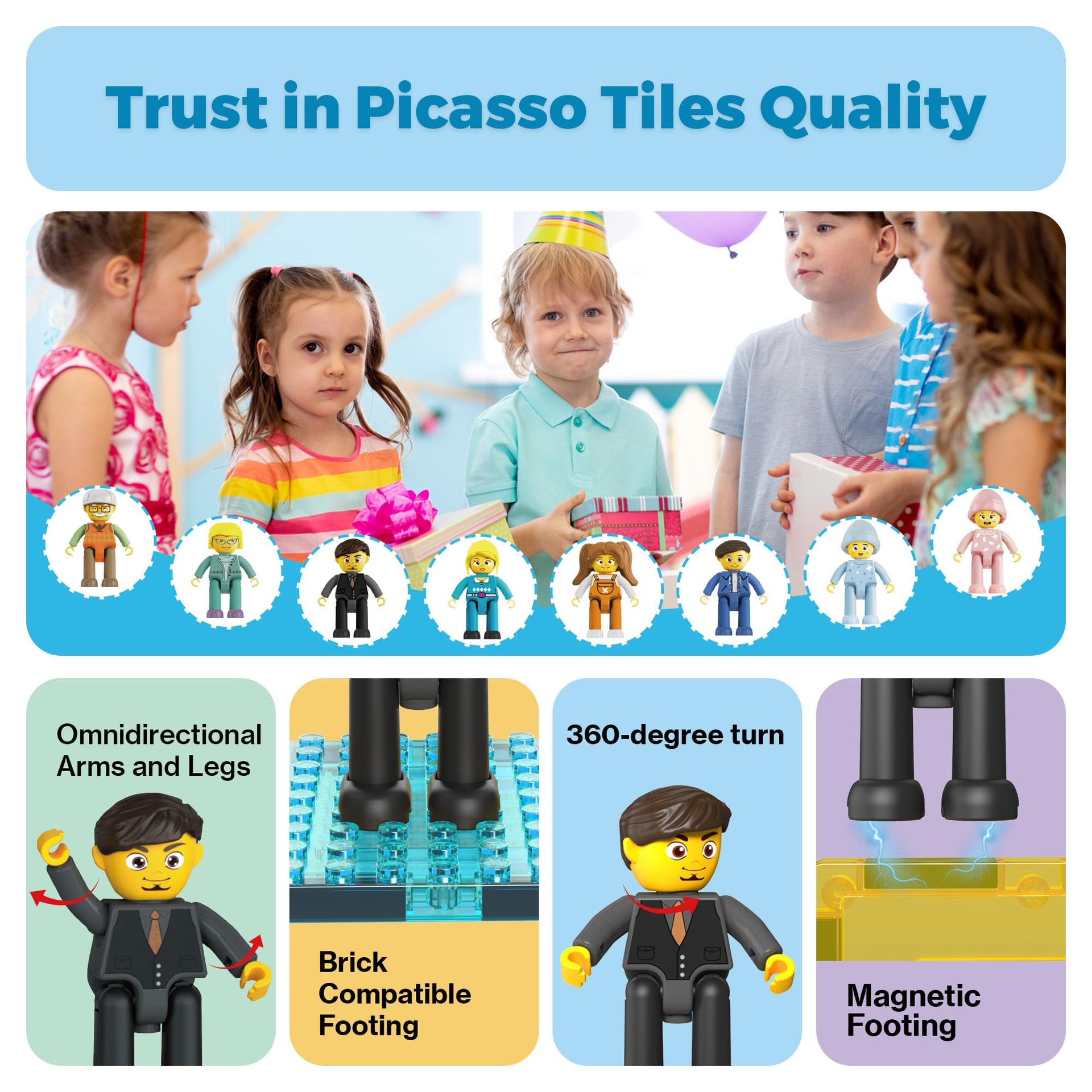 - COMPATIBLE WITH MAGNETIC BUILDING TILES: Designed to seamlessly integrate with standard magnetic building tiles, these figures attach securely, adding a new dimension to construction play. Children can incorporate characters into their structures, fostering creativity and expanding the possibilities of their architectural designs.