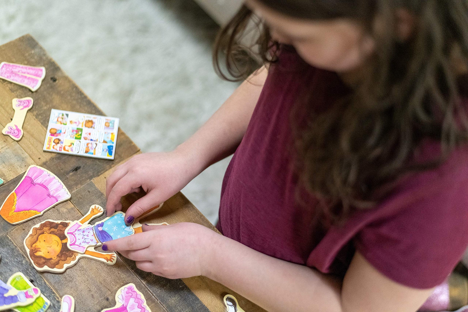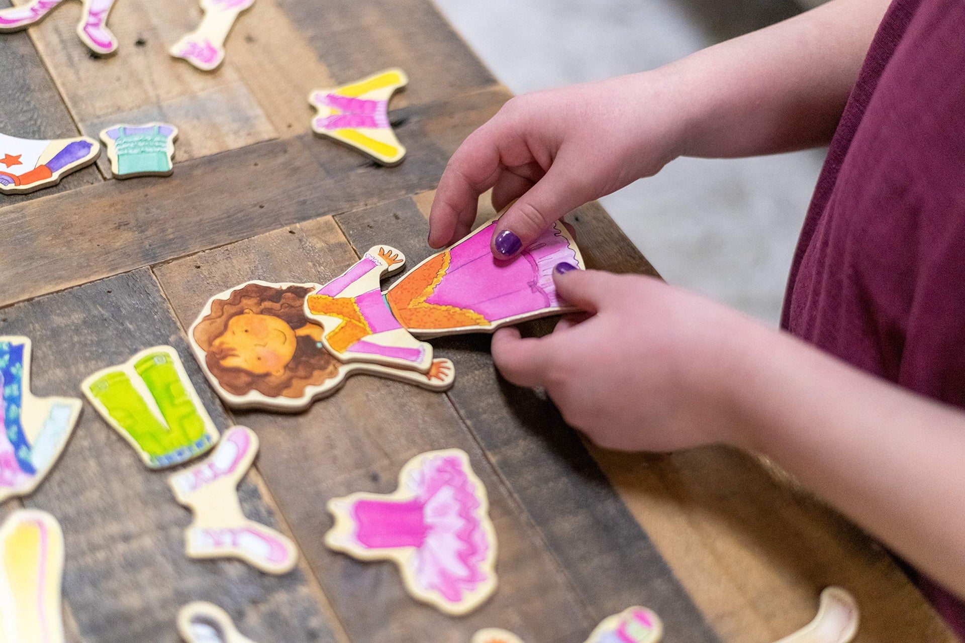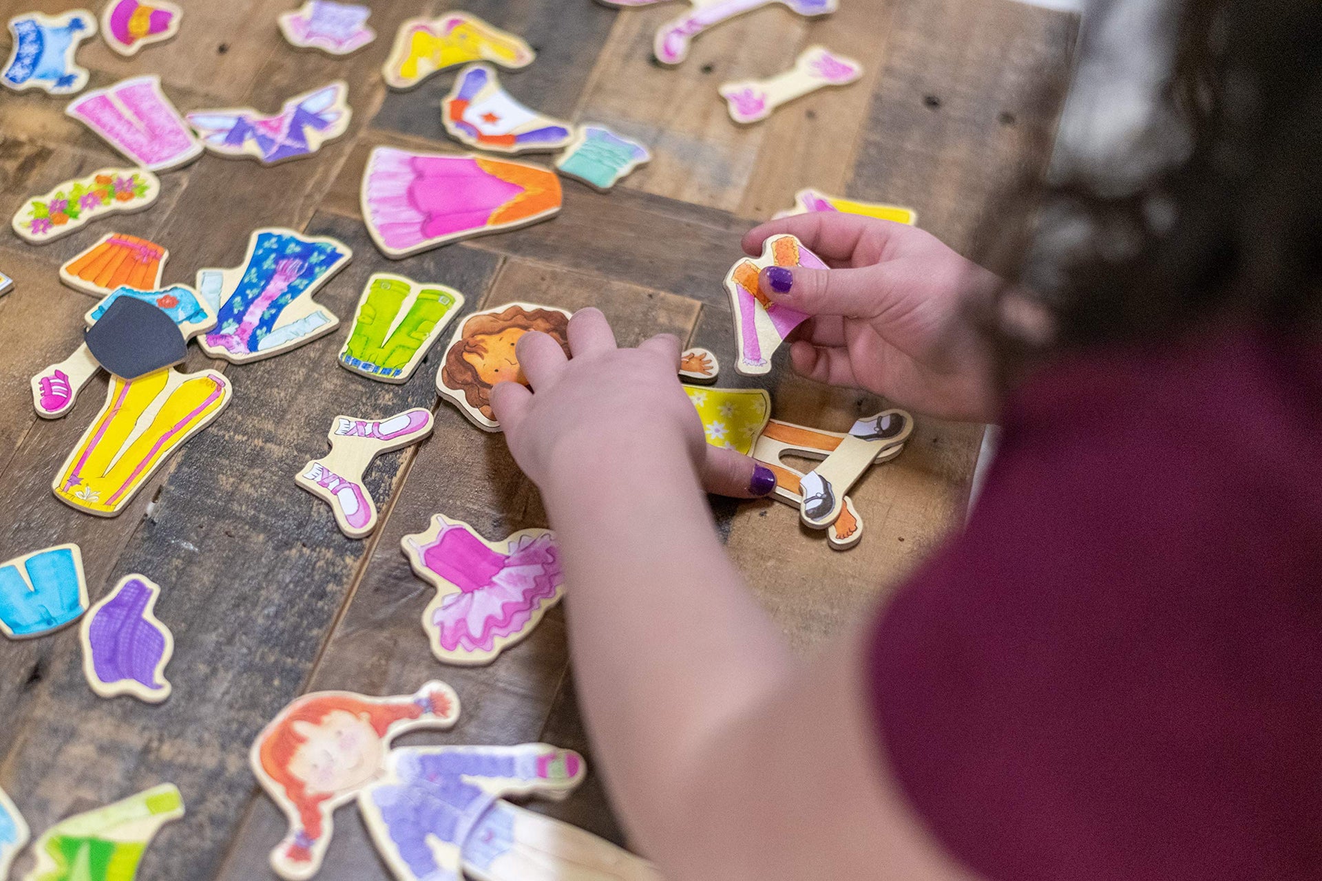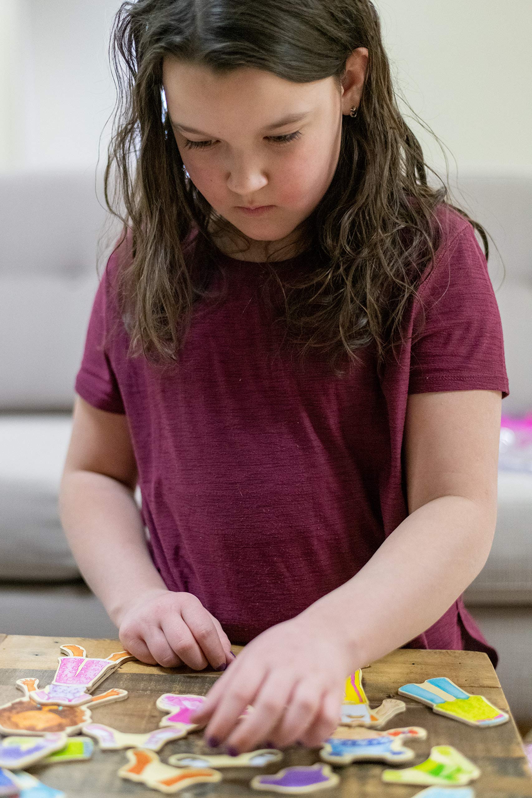 Details: T.S. Shure by Bendon Magnetic Wooden Dress-Up Dolls provide hours of imaginative pretend play. Your little one can dress up these adorable dolls in mix-and-match outfits. The clear tote with snap closure pockets is perfect for travel and storage at home! Includes 2 magnetic wooden dolls and 40 illustrated magnetic wooden clothing pieces! The clear vinyl tote with snap closure pocket, feather trim, and handles is perfect for travel and storage. Mix and match outfit pieces while this this beautifully illustrated set provides hours of imaginative pretend play! Ideal for ages 3 and up.