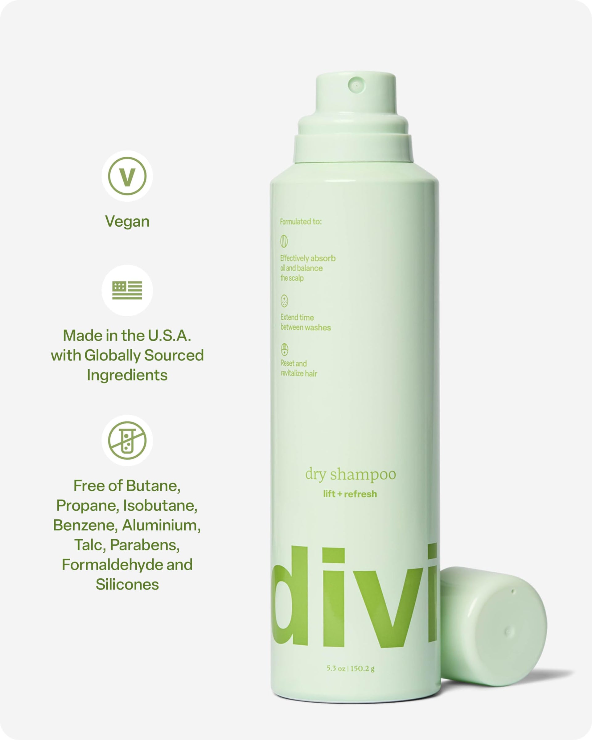 - EXTEND TIME BETWEEN WASHES: Divi’s Dry Shampoo is benzene and talc-free and made for on-the-go oil absorption, extended time between washes, and a boost of volume at the root. Perfect for on-the-go use, our easy-to-use spray nozzle ensures precise application wherever you are.