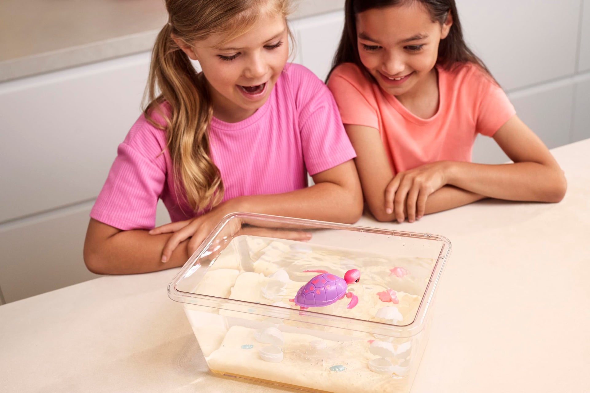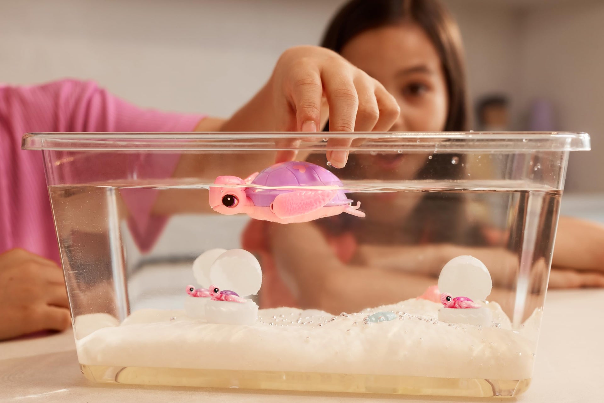 Details: Your Mama Turtle Surprise is here to hatch her adorable family! How many baby turtles will she reveal? 2, 3, or even 4? Plus, there may even be other surprises to discover along the way! When she’s not caring for her babies, Mama Turtle comes alive and swims in a full tank of water, bringing endless joy and wonder! Simply fill the tank with water and watch as Mama Turtle gracefully swims around, bringing her underwater world to life. Mama Turtle doesn’t just swim - she also loves to get out of the water and walk on land, just like a real turtle. Create a realistic habitat, and enjoy countless adventures with Mama Turtle and her adorable family thanks to a resettable mechanism that means you can hatch her babies again and again.