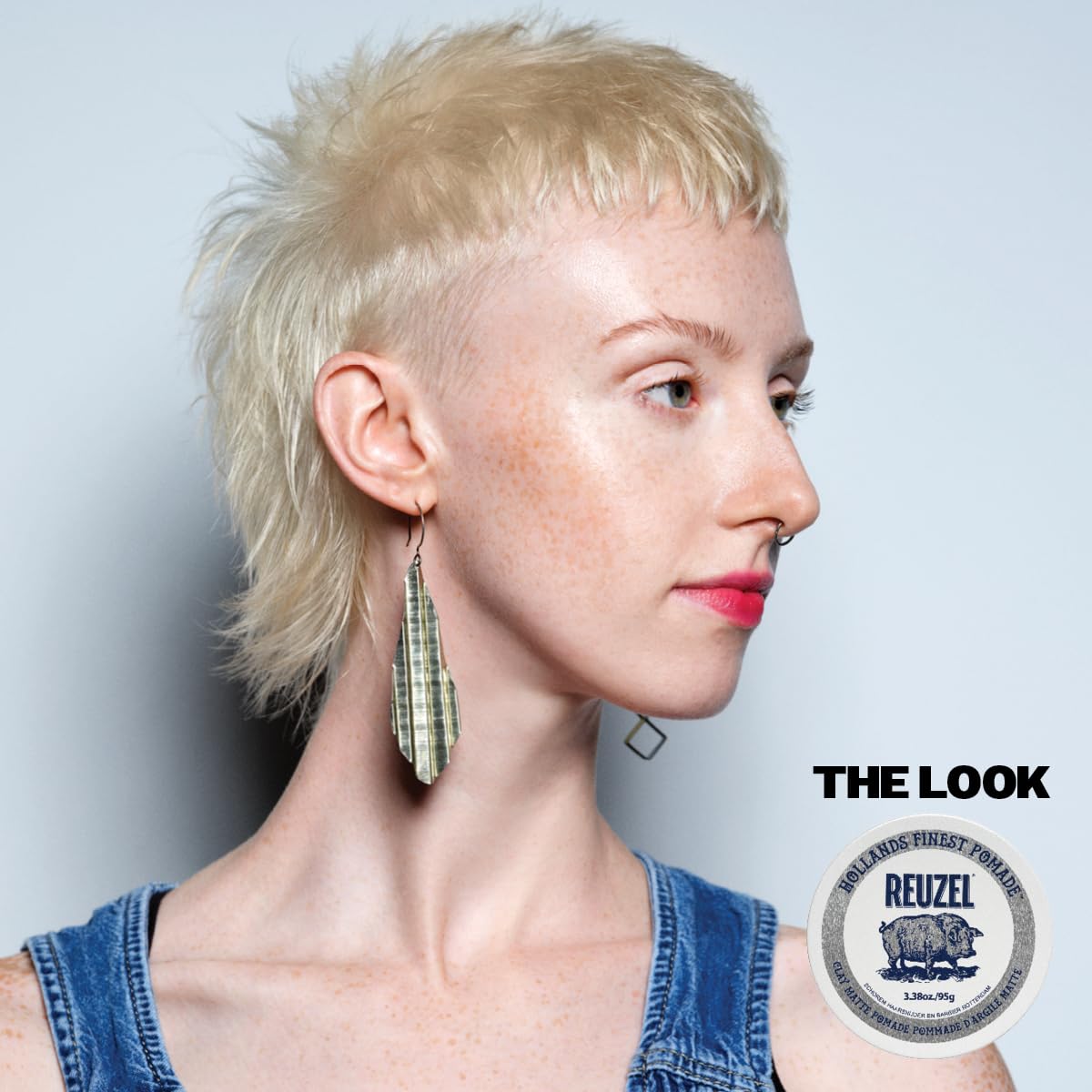 Reuzel pomade tin with blue and white design on a white background