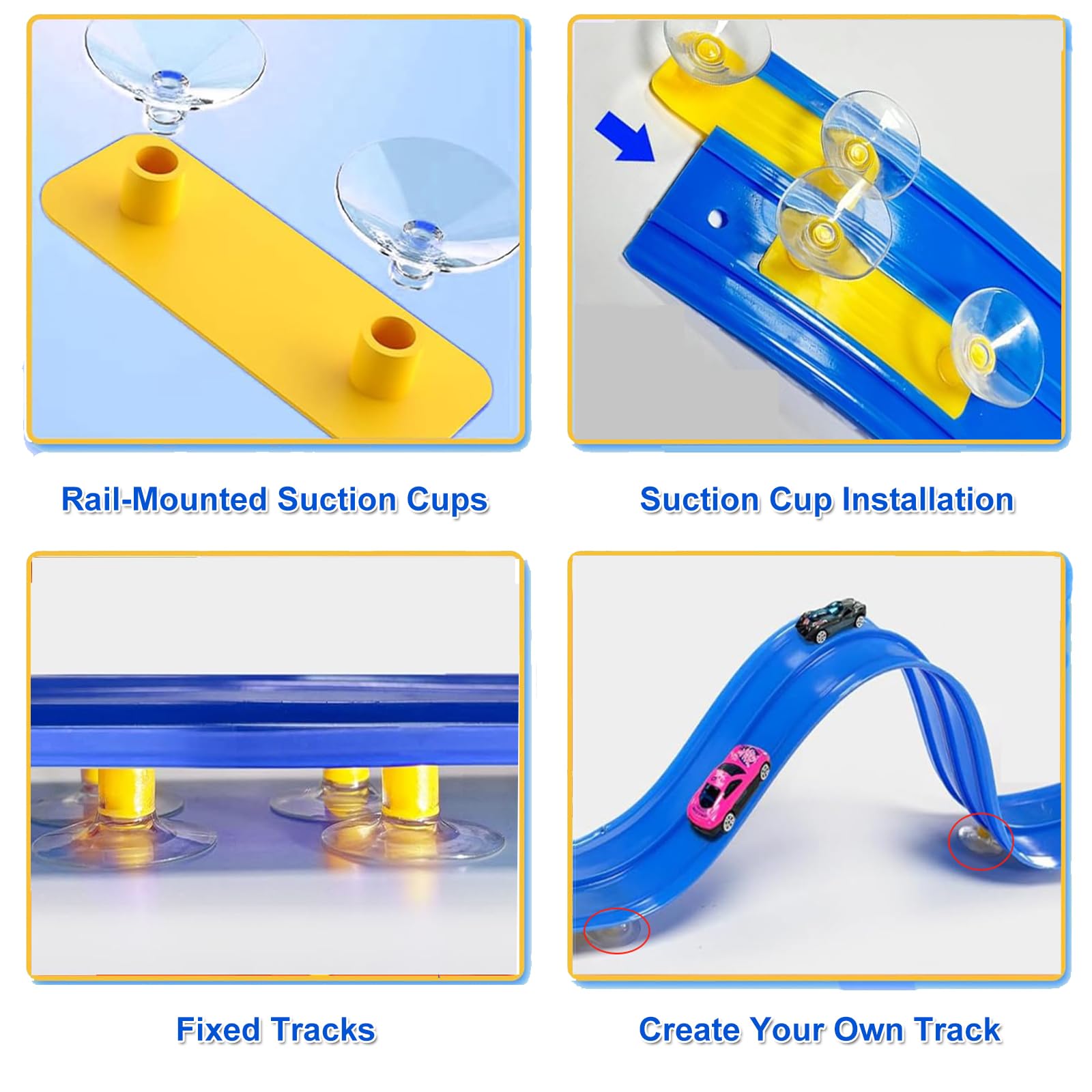 - Race Track with 10 Strong Suction Cups:Stable & Versatile for Any Smooth Surface Equipped with 8 Suction Cups for Middle Track& 2 Strong Suction Cups for Top Track, Widely used on windows, kitchen tiles, refrigerators, coffee tables,10pcs strong suction keeps the track from slipping or shifting during intense races, No slipping, no Falling!