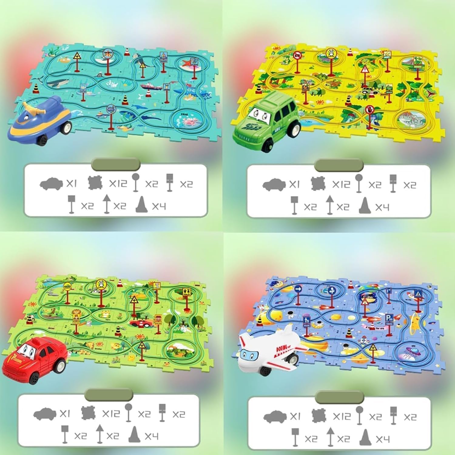 - 【Upgrade Configuration: 4 Style 4 in 1】:This kid's puzzle set includes 16 puzzle pieces, 12 road signs, 4 toy car. Kids need to assemble the puzzle pieces in a certain to allow the plane to follow the track. Our jigsaw game features a colorful, vibrant map with tons of possibilities! Amazing games for kids indoor games & lovely toys for kids with track big size for group fun.