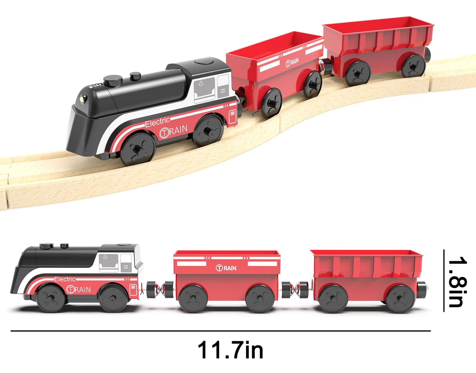- Motorized train is a great addition to wooden railway track, pulling multiple cars if request to create a longer trains to make more imaginative scenarios, providing hours of playtime for toddlers.