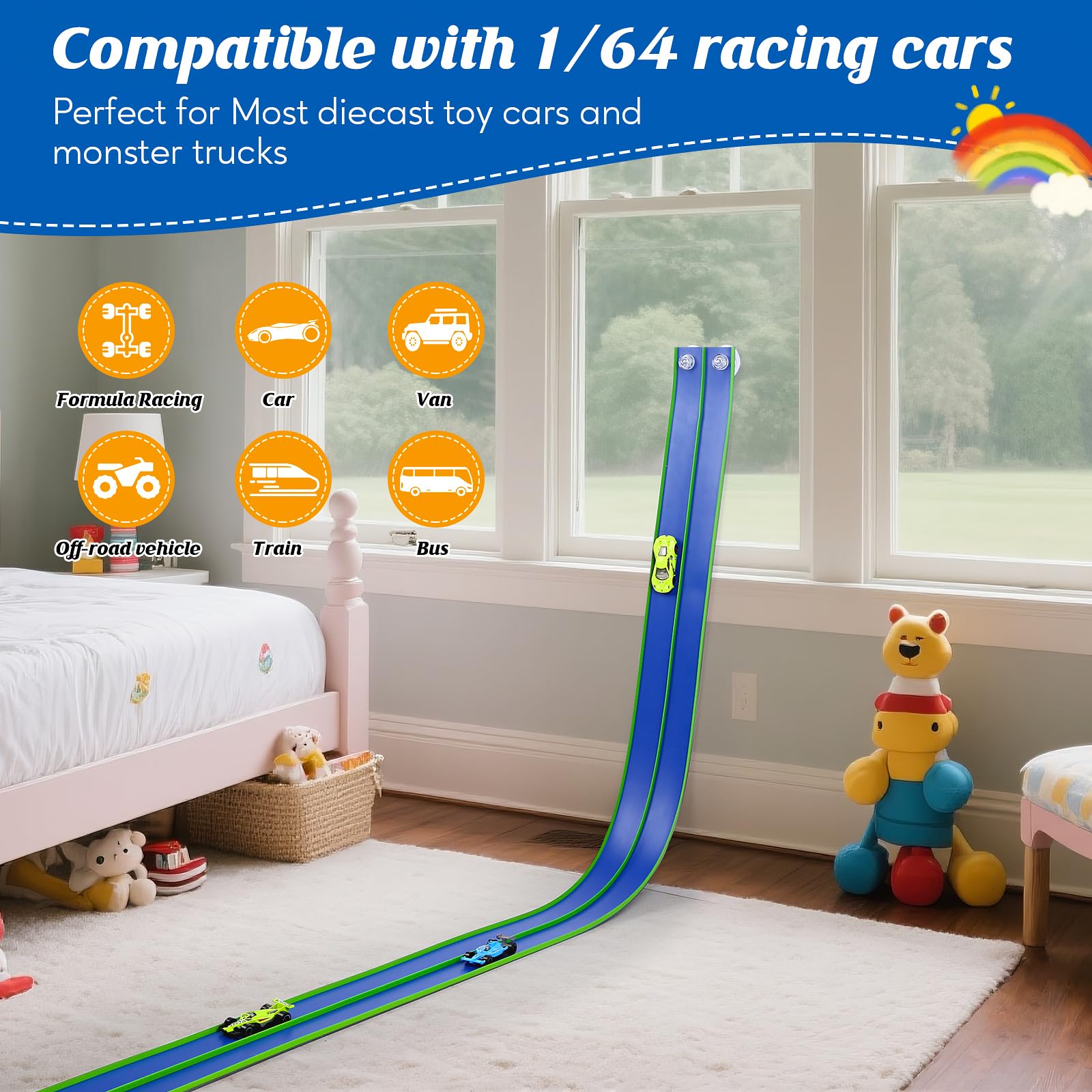 - Flexible 15ft Race Car Track Starter Set with Suction Cups, 1:64 Diecast Cars, Portable Roll-Up Racetrack for Kids Ages 3+ (Blue & Green)