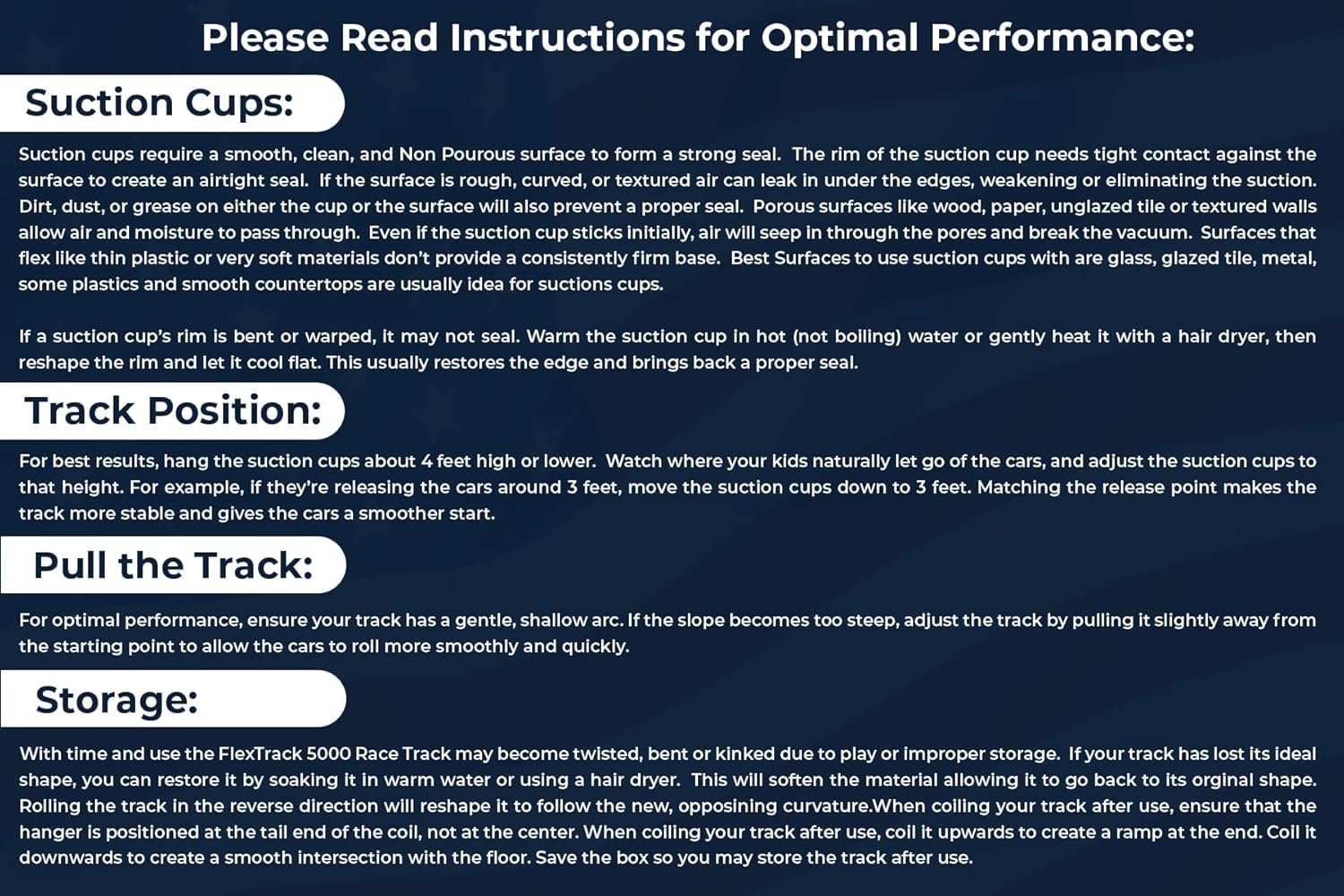 - Suction Cups Use Anywhere: But lo, intrepid adventurers, the FlexTrack 5000 harbors yet another boon beyond its thrilling loops and daring leaps. Fortified with mighty suction cups of legendary tenacity, this enchanted track clings to nearly any surface you desire, windows, tables, doors, even countertops! Stationary courses are a relic of the past; with FlexTrack, the entire realm is your racetrack. Whether racing down the fridge door or careening down the stairs, this track holds firm, anchoring even the boldest of ramps with unyielding power. Ready to make your lair a legendary speedway?