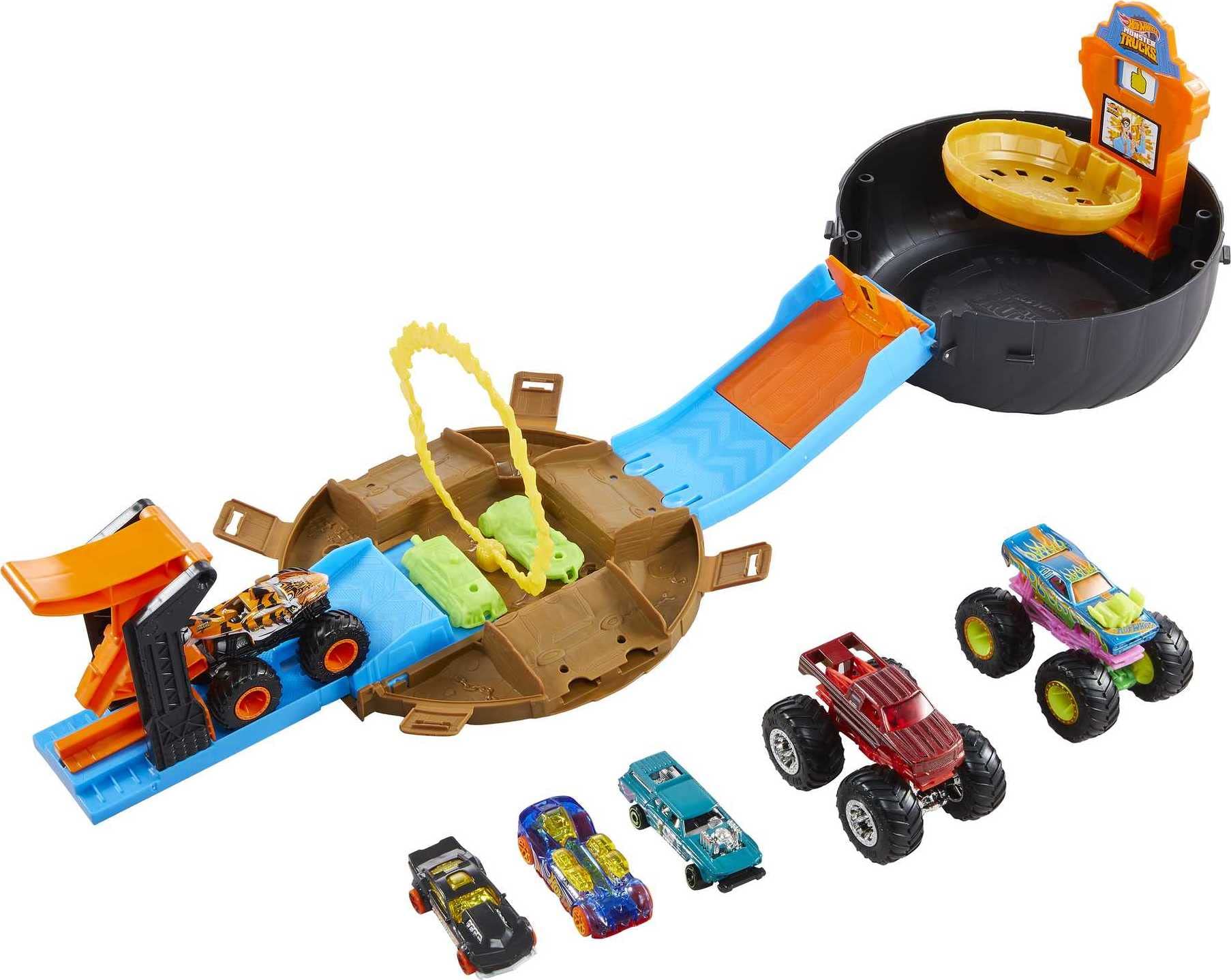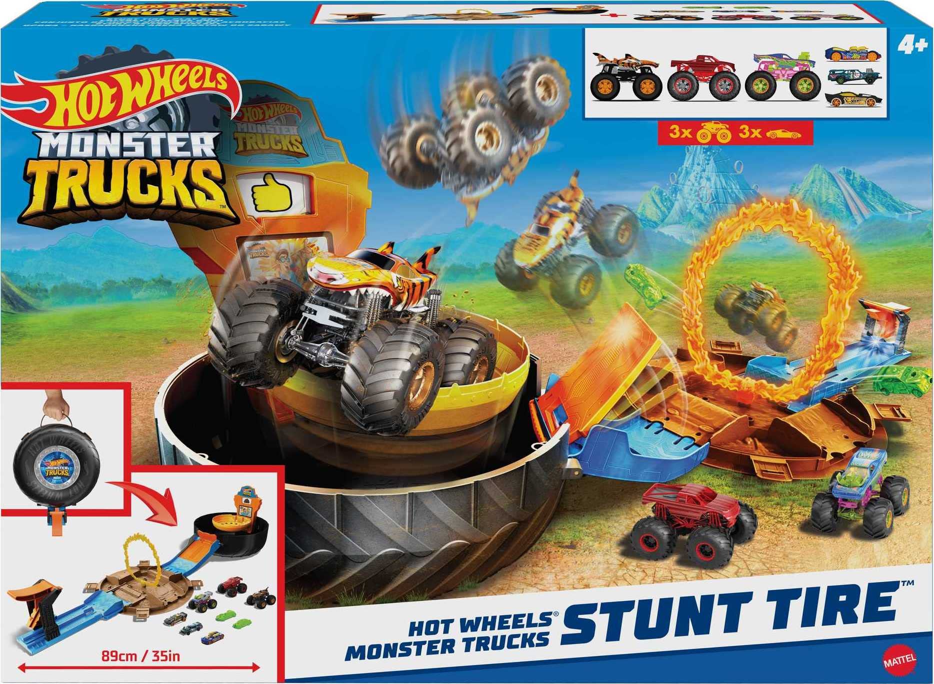 - The Hot Wheels Monster Trucks Stunt Tire playset is impressive open or closed. The oversized monster truck tire holds a stunt track that's more than 35 inches long and includes a handle for portability when closed.