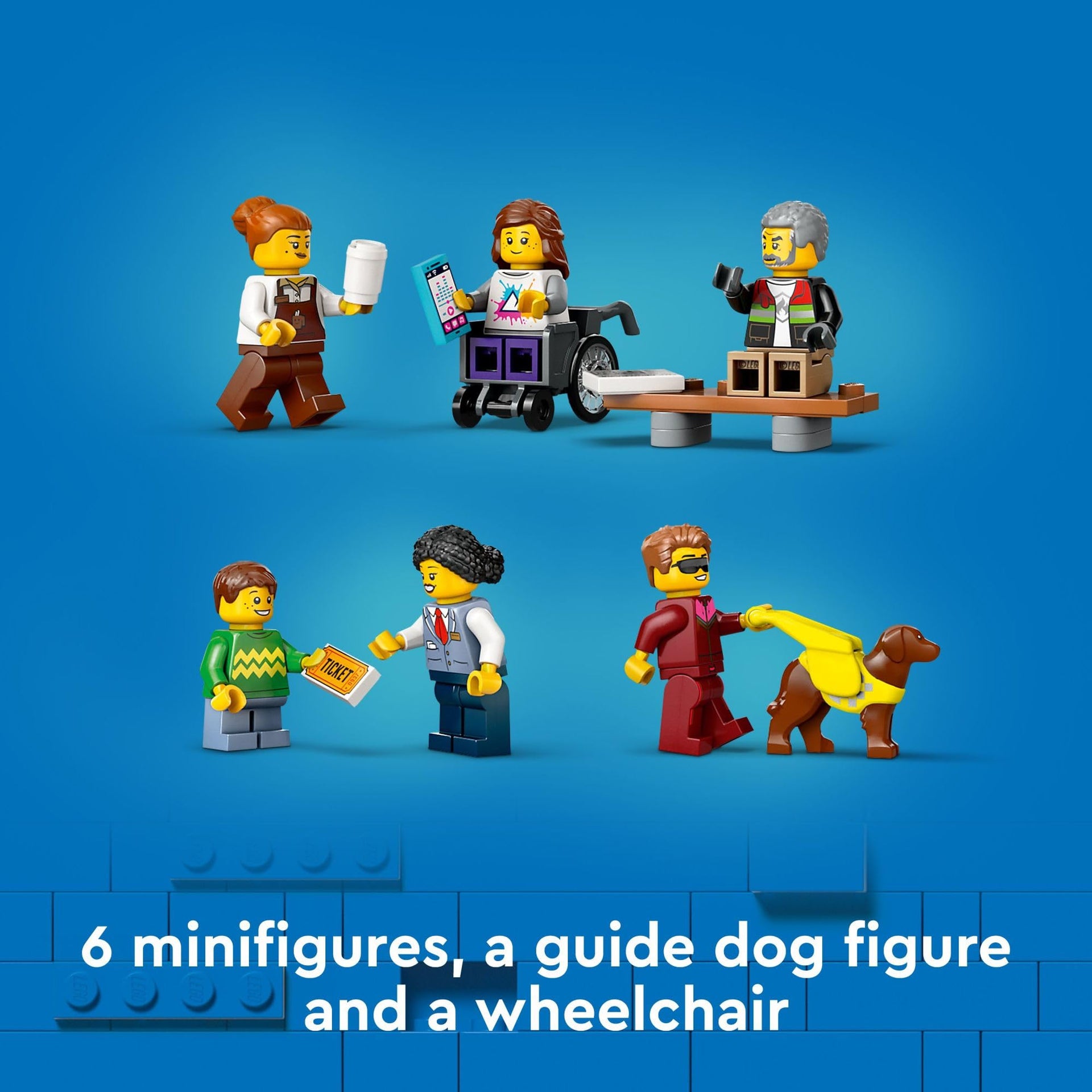 - What’s in the box? – This LEGO City toy includes everything kids need to build a toy streetcar and a station with a passenger platform and coffee shop, plus 6 minifigures and a guide dog figure