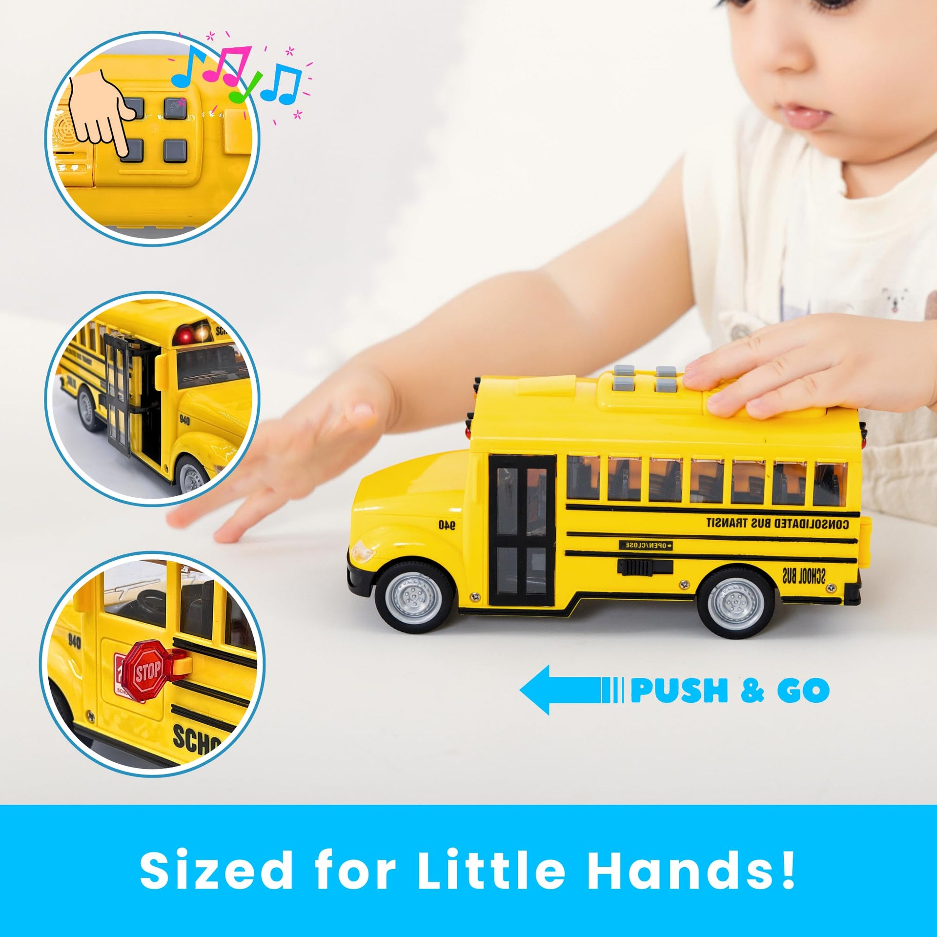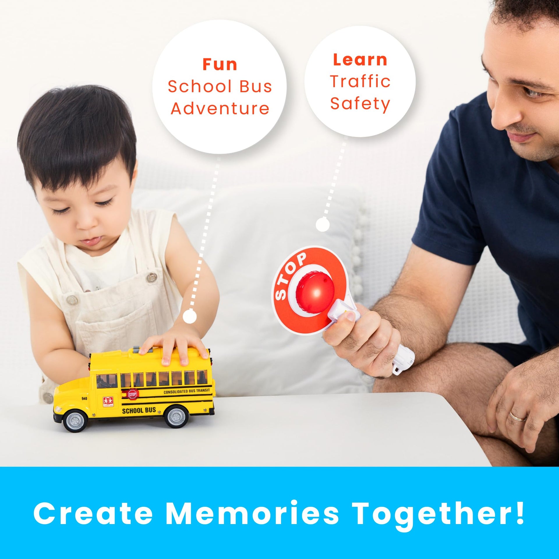 - REALISTIC FEATURES - The school bus toy is designed with attention to detail, featuring vibrant colors, moving wheels, and doors that open and close. The included School Crossing Guard Baton enhances the play experience, allowing kids to mimic the important role of a crossing guard.