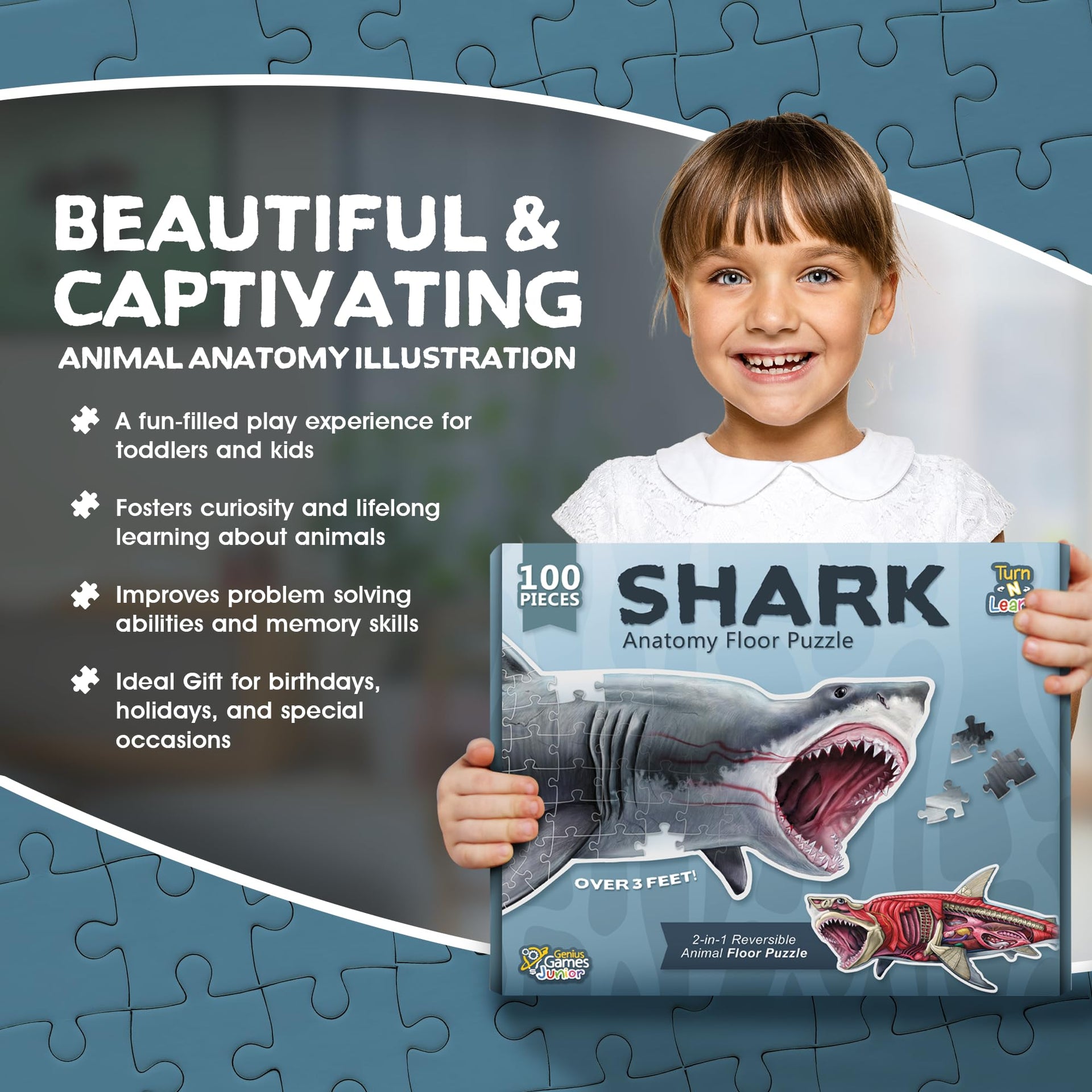 - DOUBLE SIDED DESIGN: This Shark Animal jigsaw puzzle boasts a unique double-sided design. On one side, you'll find stunning artwork of the Great White Shark, a supreme predatory fish that patrols all major oceans’ coasts, consuming halibut, dolphins, seals, and sea lions. On the other side, you'll discover a scientifically-accurate reconstruction of the animal's anatomy. This dual-sided approach offers both aesthetic appreciation and educational value, making it a versatile learning tool.