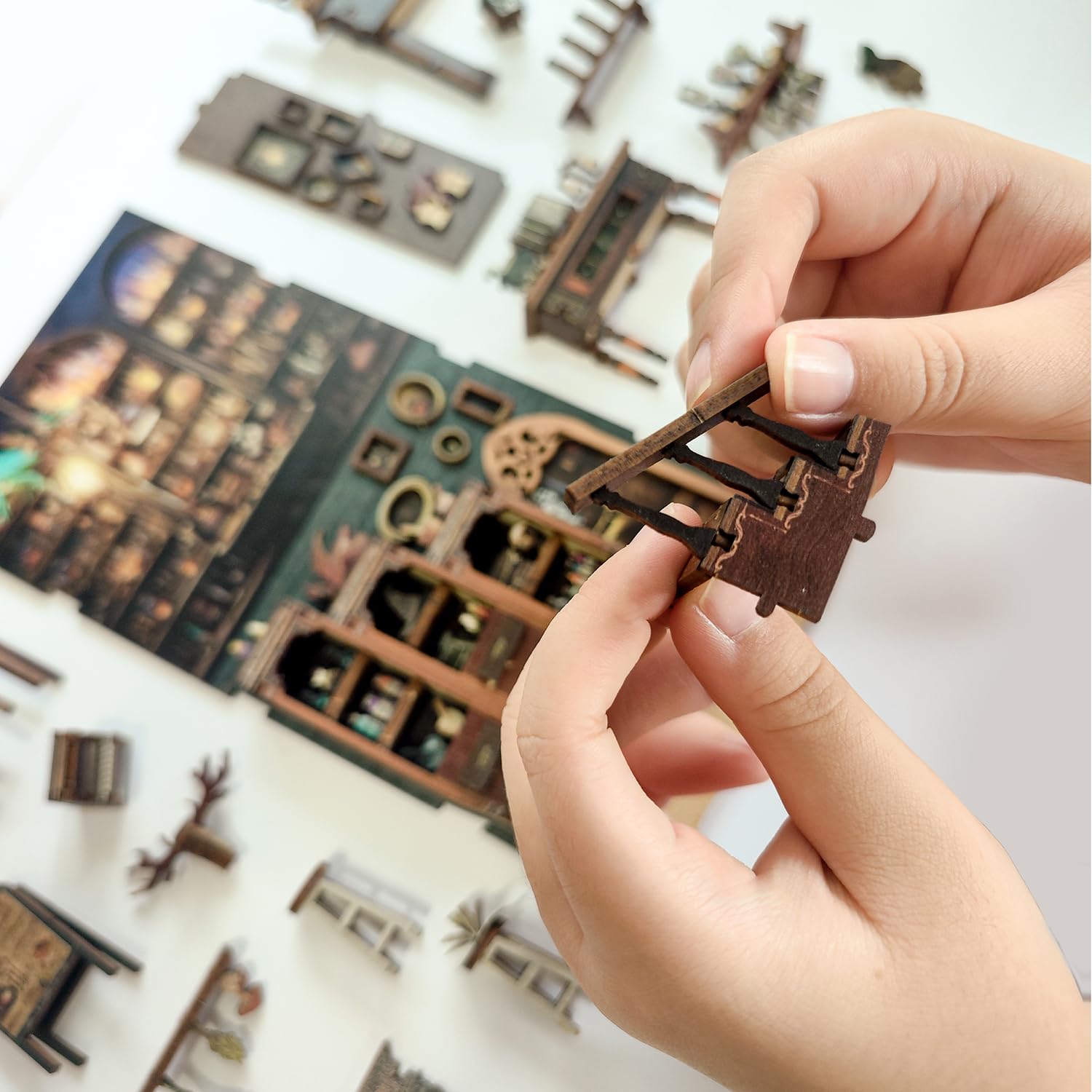 - [HUGE MINIATURE FUN]Precisely cut wooden boards are assembled into exquisite 3d wooden puzzle booknook by mortise-and-tenon construction. The bookshelf inserting a book nook kit can create a mysterious atmosphere.