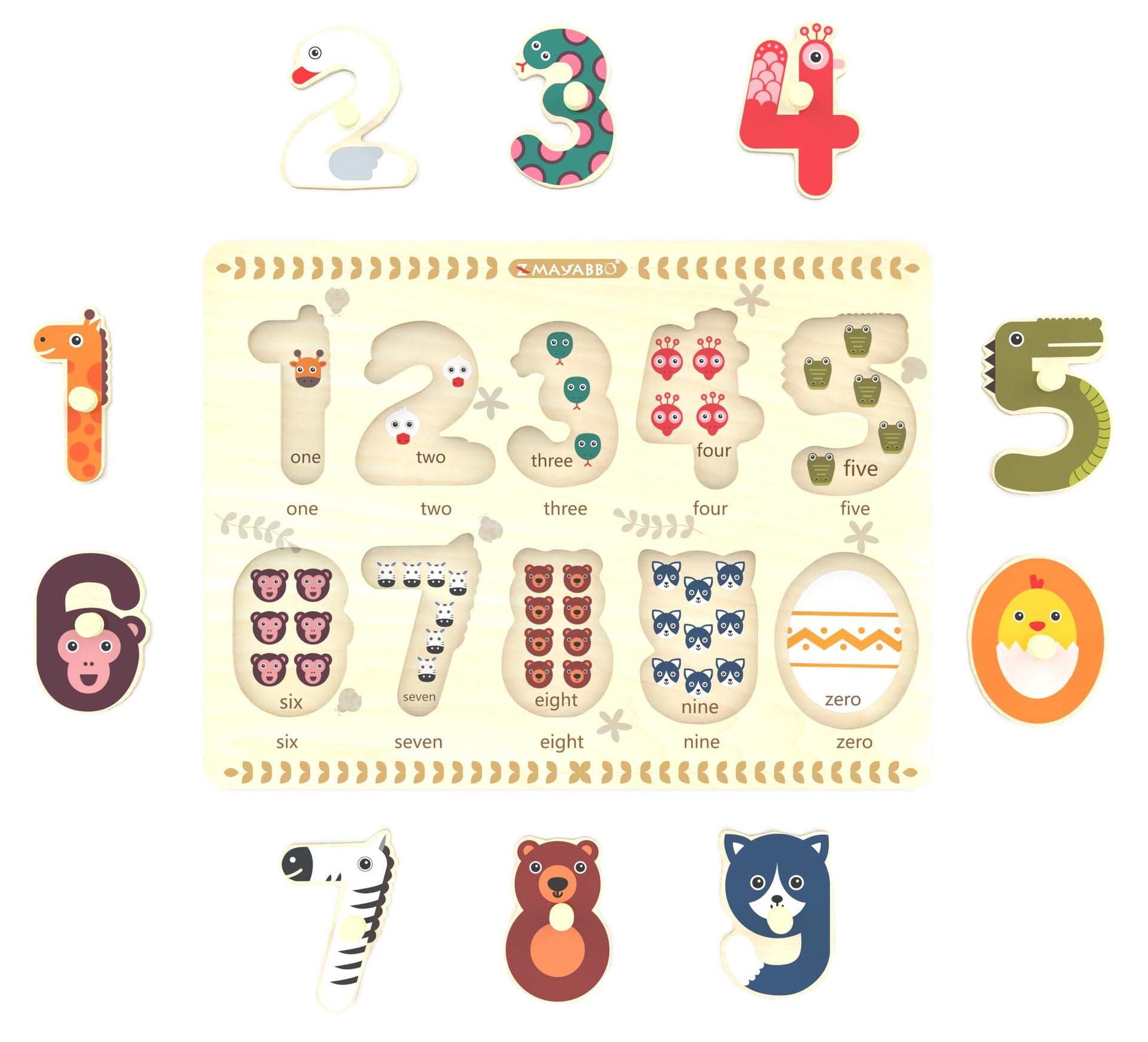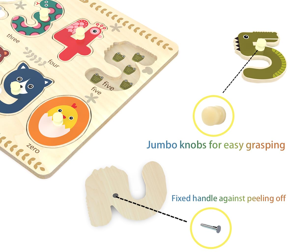 - Toddler wooden puzzles featuring 10-piece wood number peg puzzles for matching numbers with pictures on the sturdy puzzle board, coming with bright color and cute illustrations of numbers, will be a great early educational learning toys for kids.