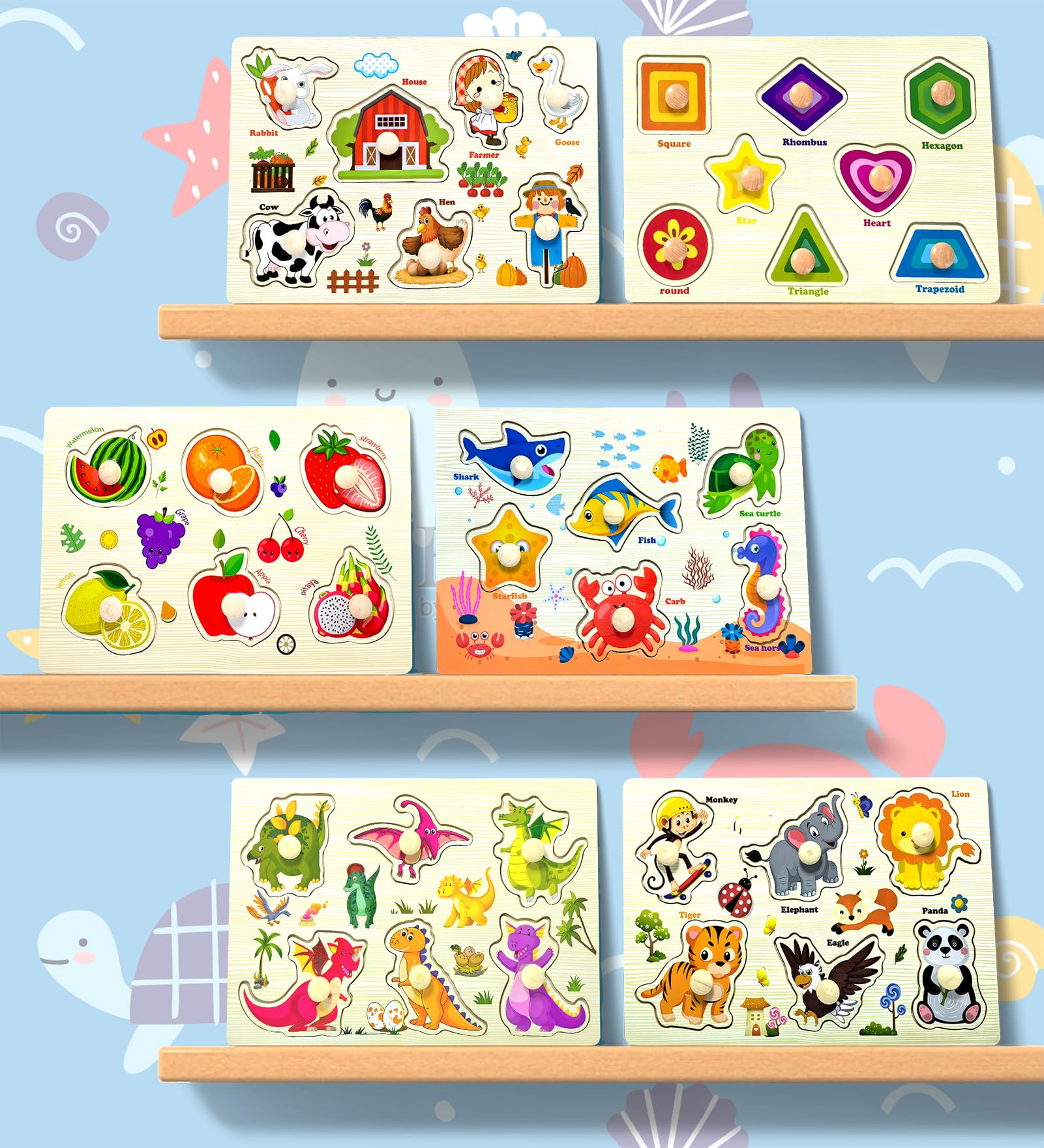 - 【Exceptional puzzle set】Package comes with 1 gift box and 6 (Shape,Farm,Halobios,Fruits,Animals,Dinosaurs)wooden montessori toddler pegged puzzles.Fun shapes, detailed images of farm and ocean animals will develop eye-hand coordination, fine motor and problem-solving skills, memory of your kids.
