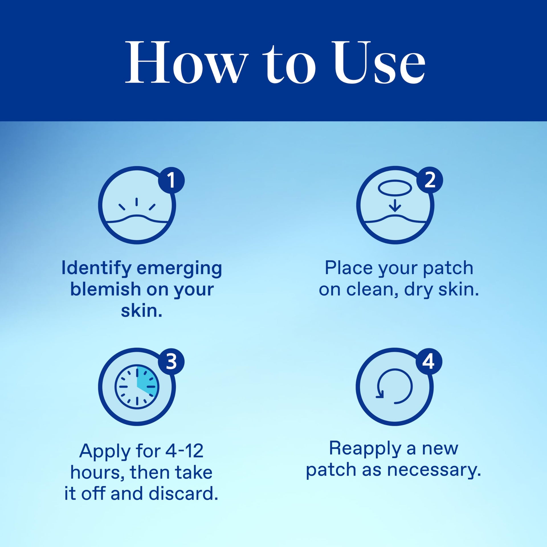 Details: Take on trouble spots with Differin Acne-Prone Skin Patches. Formulated with salicylic acid, these patches exfoliate to help shrink the appearance of imperfections. These invisible ultra-thin patches are makeup-friendly, waterproof, and sweatproof, so you can wear them day and night. The triple-action�technology�starts working fast to flatten, soothe, and protect the area. Dermatologist-tested, the patches are for all skin types, including acne-prone skin. Each box comes with 36 clear, easy-to-peel patches (18 small and 18 large) for any imperfection emergency.�After cleaning and drying the area, place a patch on the imperfection. Leave it on for 4 to 12 hours, remove, and discard. Reapply a new patch as necessary.