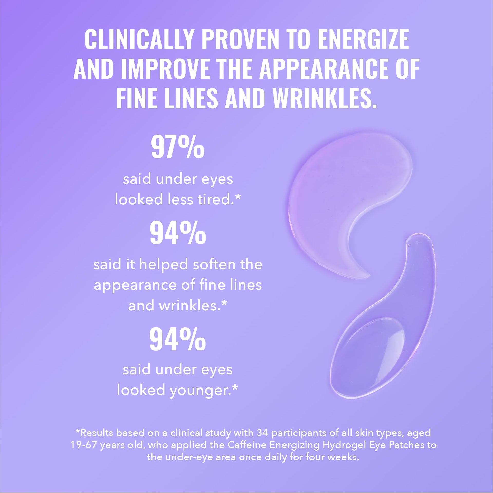 Formulated with the best ingredients to energize, firm, and depuff for brighter, more youthful-looking eyes. Our patches contain caffeine (1%) and acetyl tetrapeptide-5 to reduce signs of puffiness and swelling by decreasing fluid accumulation. Licorice extract, peptides, and aloe vera work to brighten dark circles and plump the appearance of fine lines and wrinkles. Niacinamide helps to soften signs of aging and improve visible skin tone while aloe leaf juice soothes and hydrates. Hyaluronic acid boosts moisture and can reduce the appearance of fine lines. Hydrogel technology delivers moisturizing and firming ingredients into the delicate skin of the eye contour.