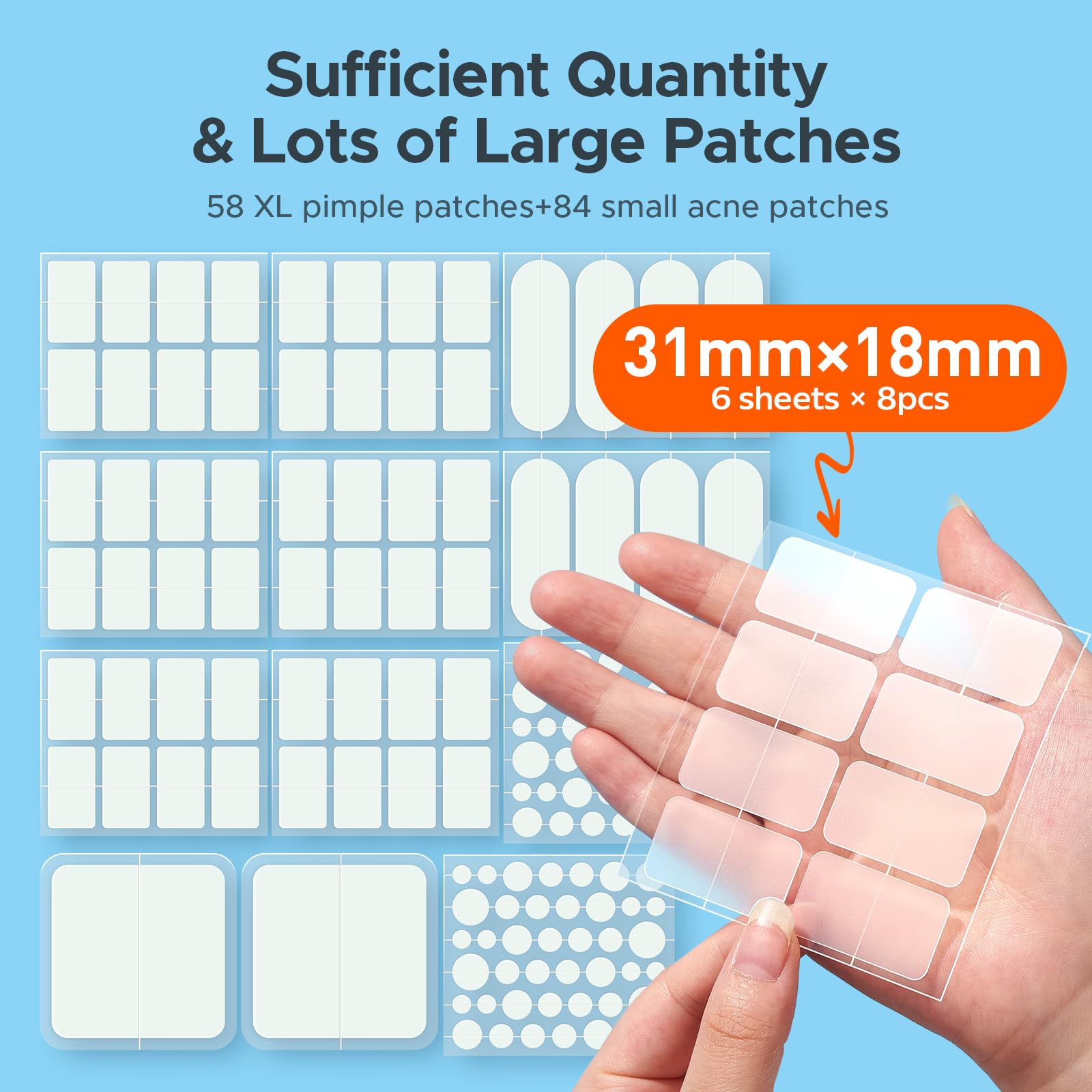 - 7 Sizes, 142 Patches for Every Need: TKTK large pimple patches come in 7 sizes (31x18mm, 60x20mm, 60x60mm, 8mm, 10mm, 12mm, 14mm), designed to target acne on various areas like your face, back, chest, chin or forehead. No matter the size or location, our hydrocolloid patches effectively fit and provide the coverage you need