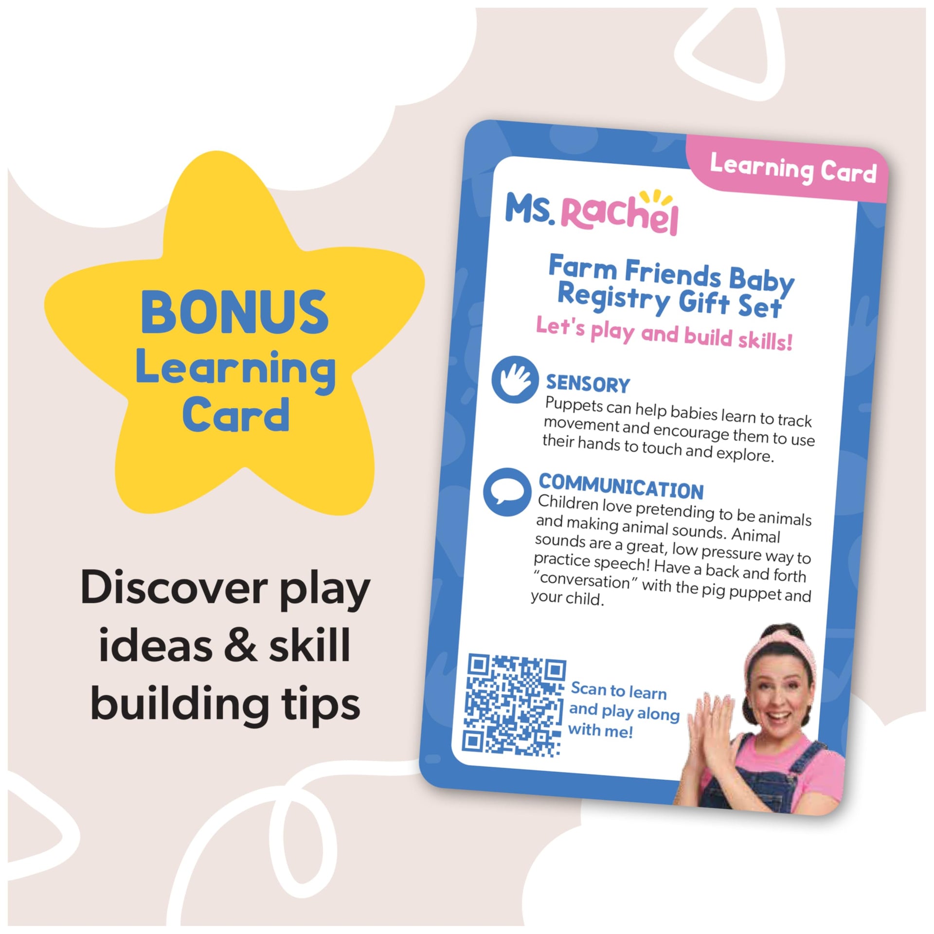 - Official Ms. Rachel Toys: Give littles the gift of Ms. Rachel with the Farm Friends Baby Registry Gift Set featuring a pig puppet, cow accessory, Ms. Rachel plush, animal cards & mirror