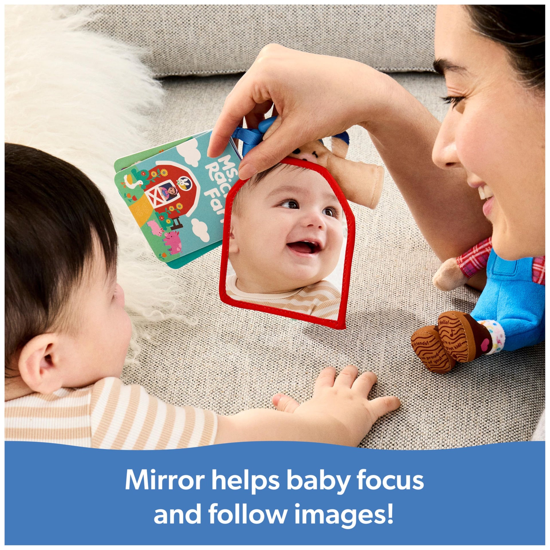 - Sensory Exploration: With soft fabrics, a textured ring and mirror, littles can explore with their different senses as they learn about farm friends, includes a learning card with play ideas & skill building tips