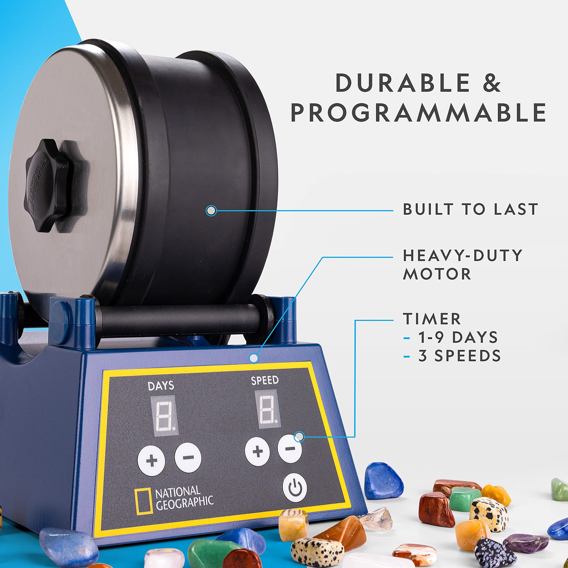National Geographic Rock Tumbler Kit – 3lb Extra-Large Barrel, 3-Speed Motor, 9-Day Timer, Includes Rocks & Grit for Kids & Adults
