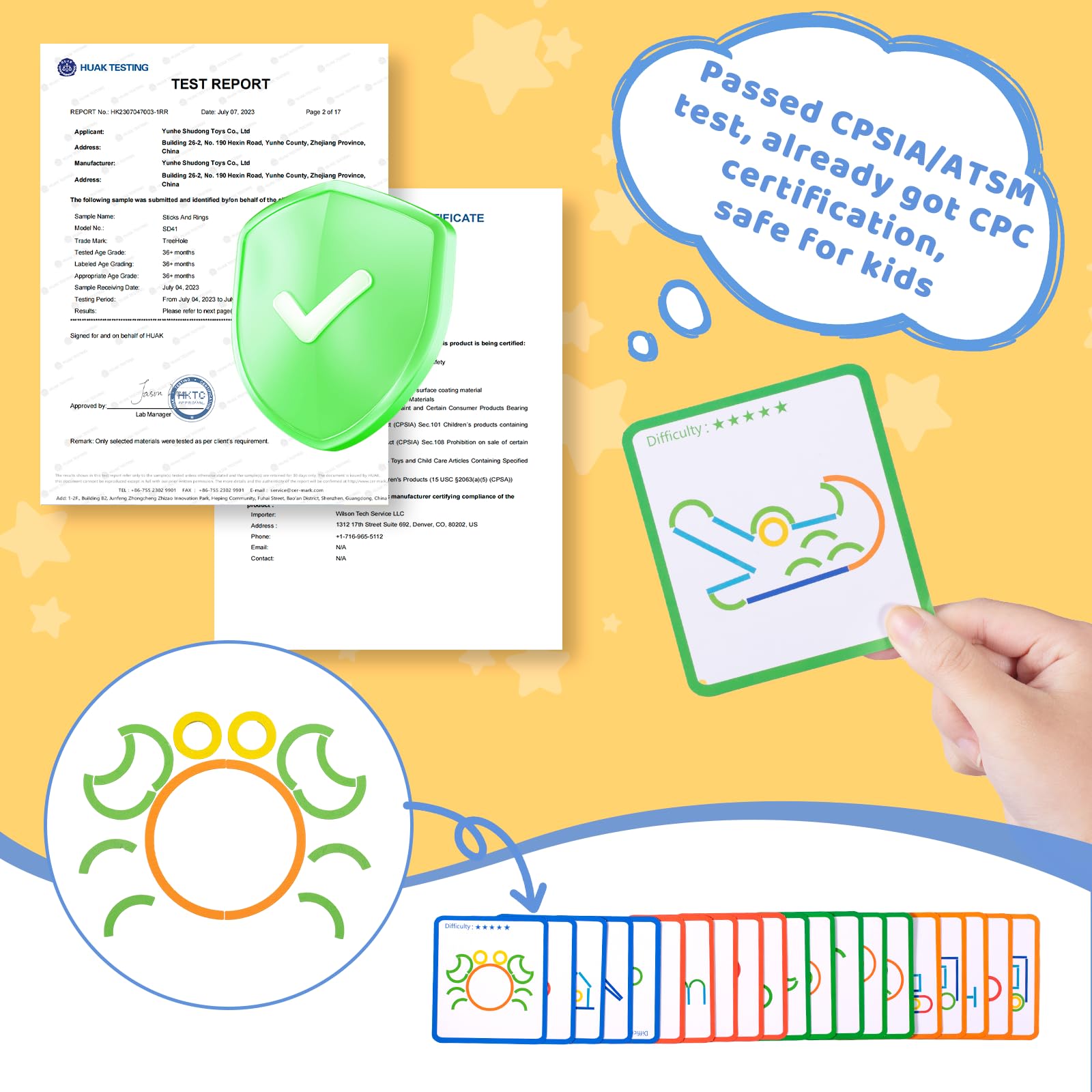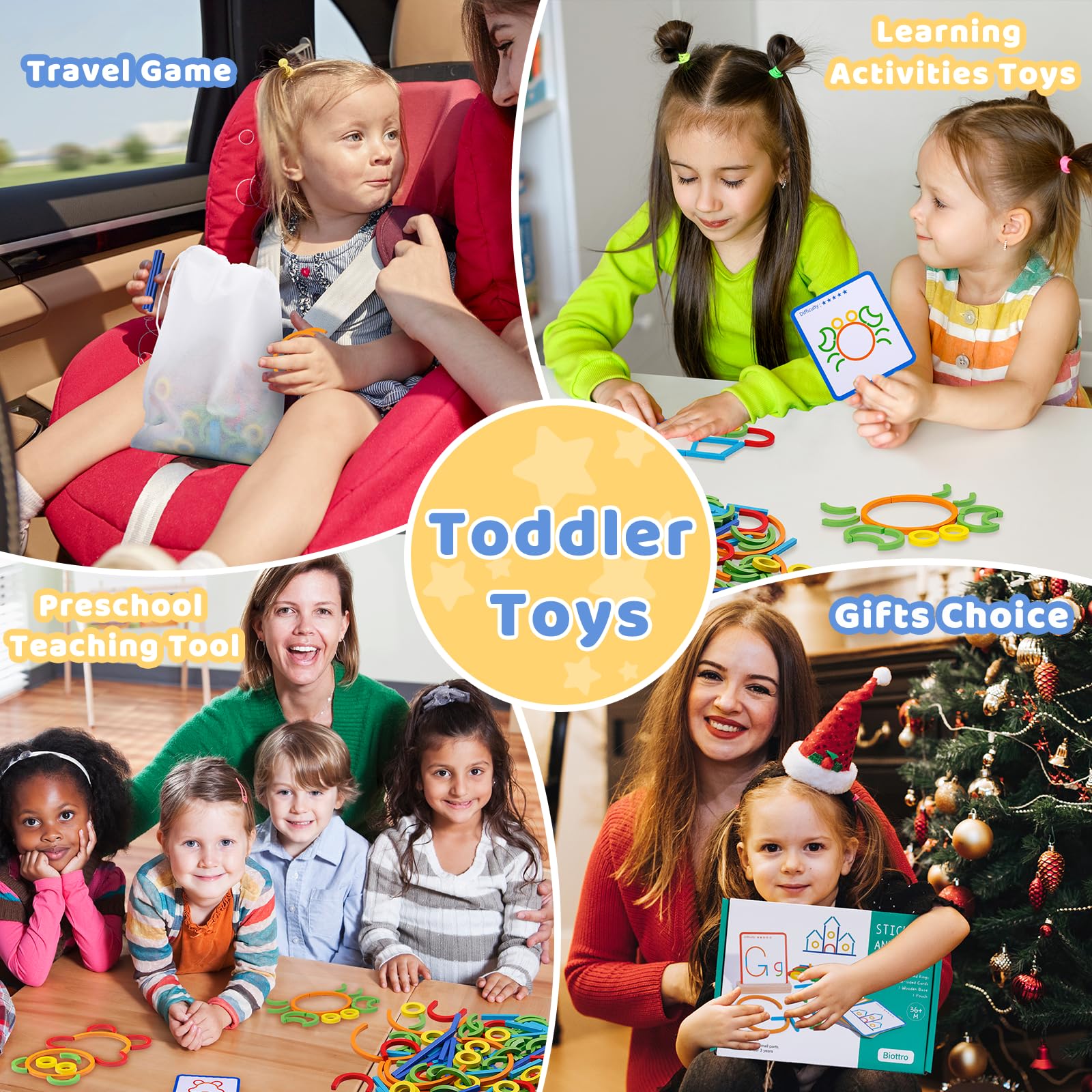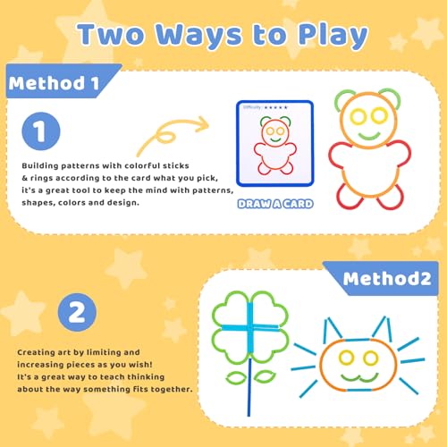 - 🧩 Creative Sticks And Rings --- Our activity toy includes: 142pcs in total sticks & rings,120pcs blocks, 20pcs double-sided cards, 1pcs wooden base, 1pcs storage bag. Building and creating letters or patterns with colorful sticks and rings(such as animals vehicles and more). Kids can trying to figure out what pieces make the designs on the card, Also, we encourage our kids create their own design. This set is a great ideal for parents who prioritize safety and mindful play.