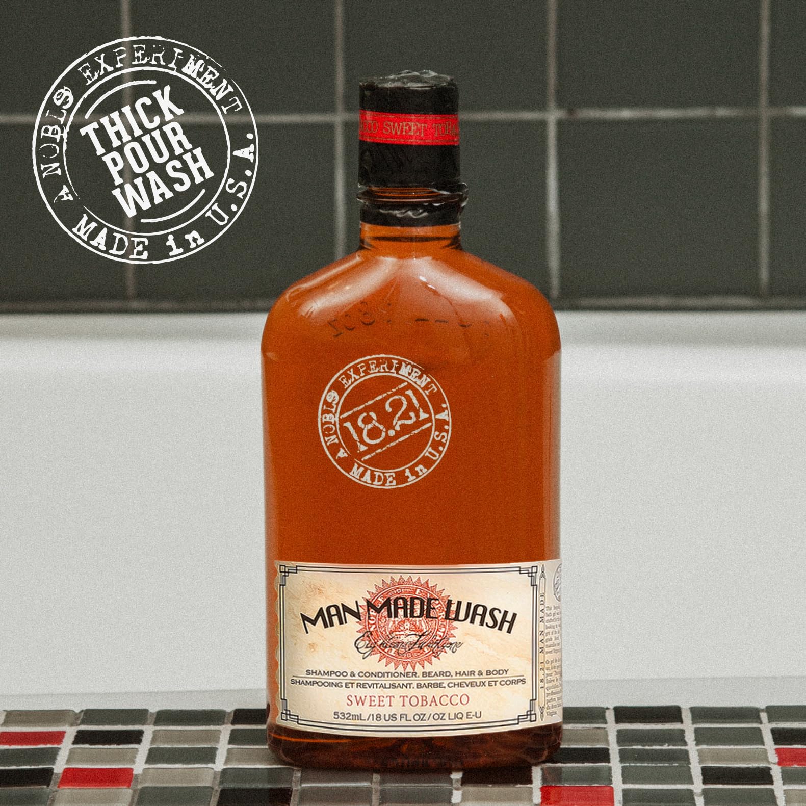 Cleanse and conditioning from head to toe. 18.21 Man Made Wash binds weightless moisture and strengthens hair and skin. Cleansing and conditioning from head to toe. Lends a natural feel and a low shine. Does not weigh hair down. Rinses out easily. Non-greasy. For all hair types. Inspired by the look and feel of fine whiskey.