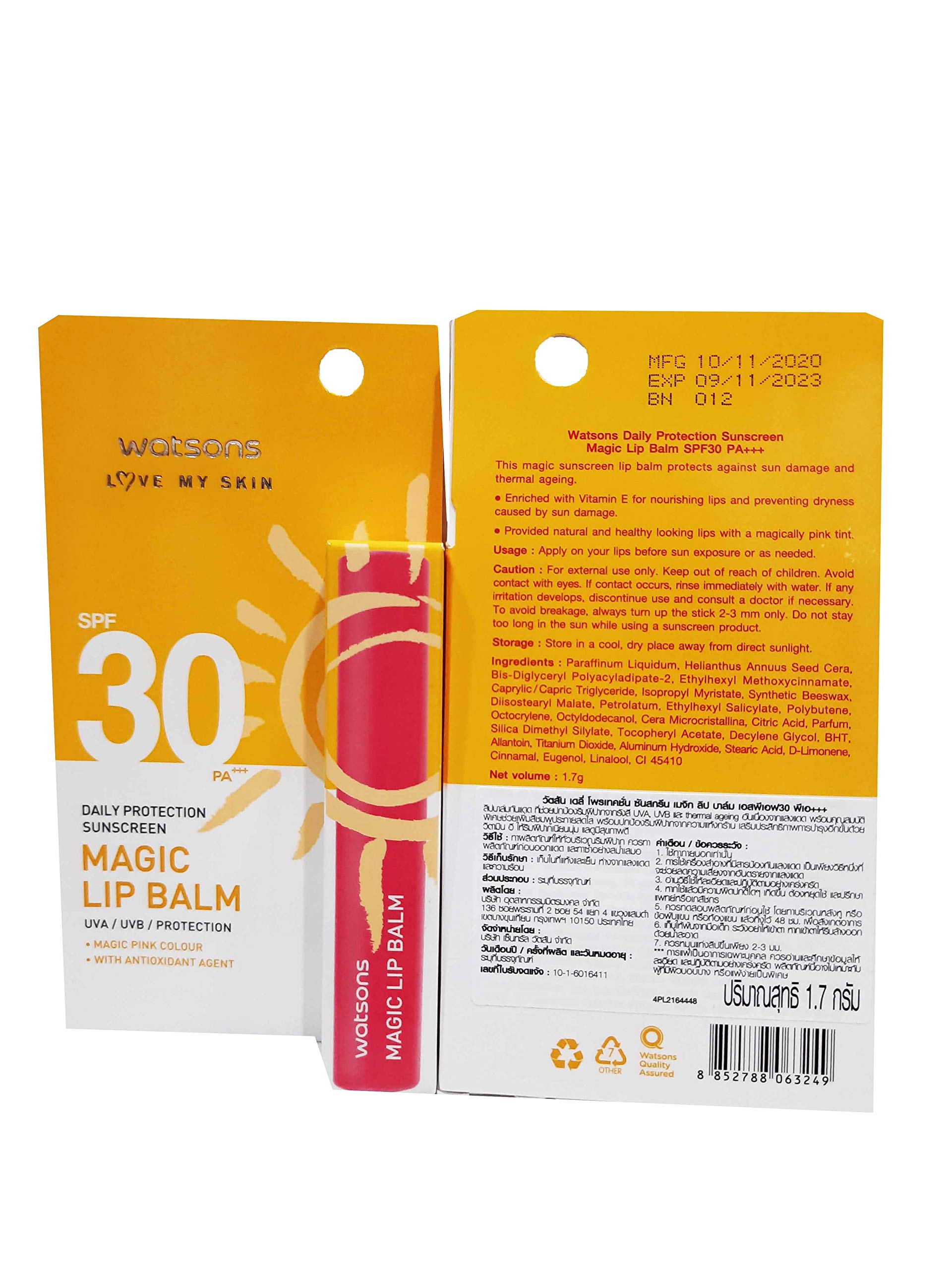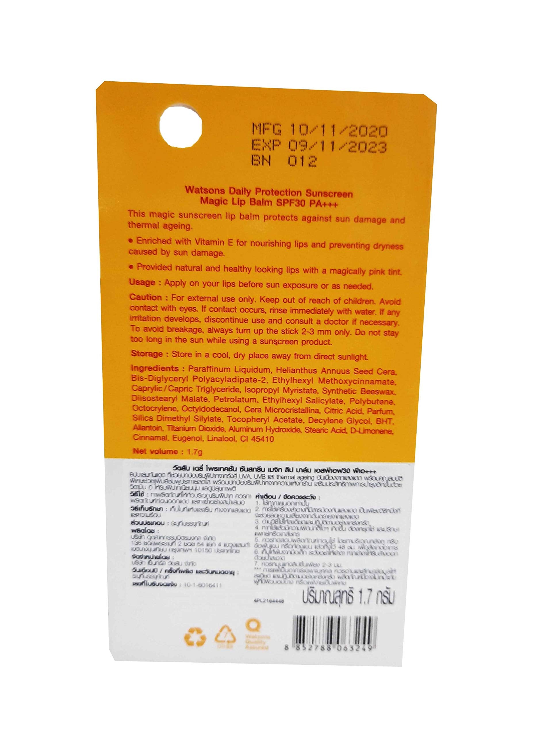 2 packs of Watsons Daily Protection Sunscreen Magic Lip Balm for effective covage. heat protection SPF30 PA+ (1.7g./ pack).