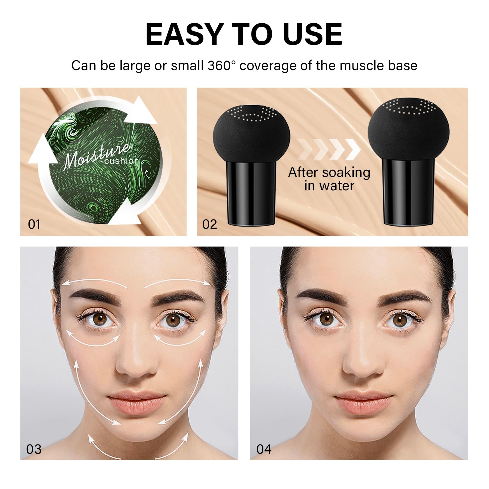 - Easy Coverage and Concealer: The full coverage foundation has an enviable long-lasting concealer formula, the mushroom head air cushion foundation is designed with a skin-friendly elastic bionic film that is easy to press out for an even and silky foundation, makeup is time-saving and quick, very convenient to apply for both makeup novices and professional makeup artists