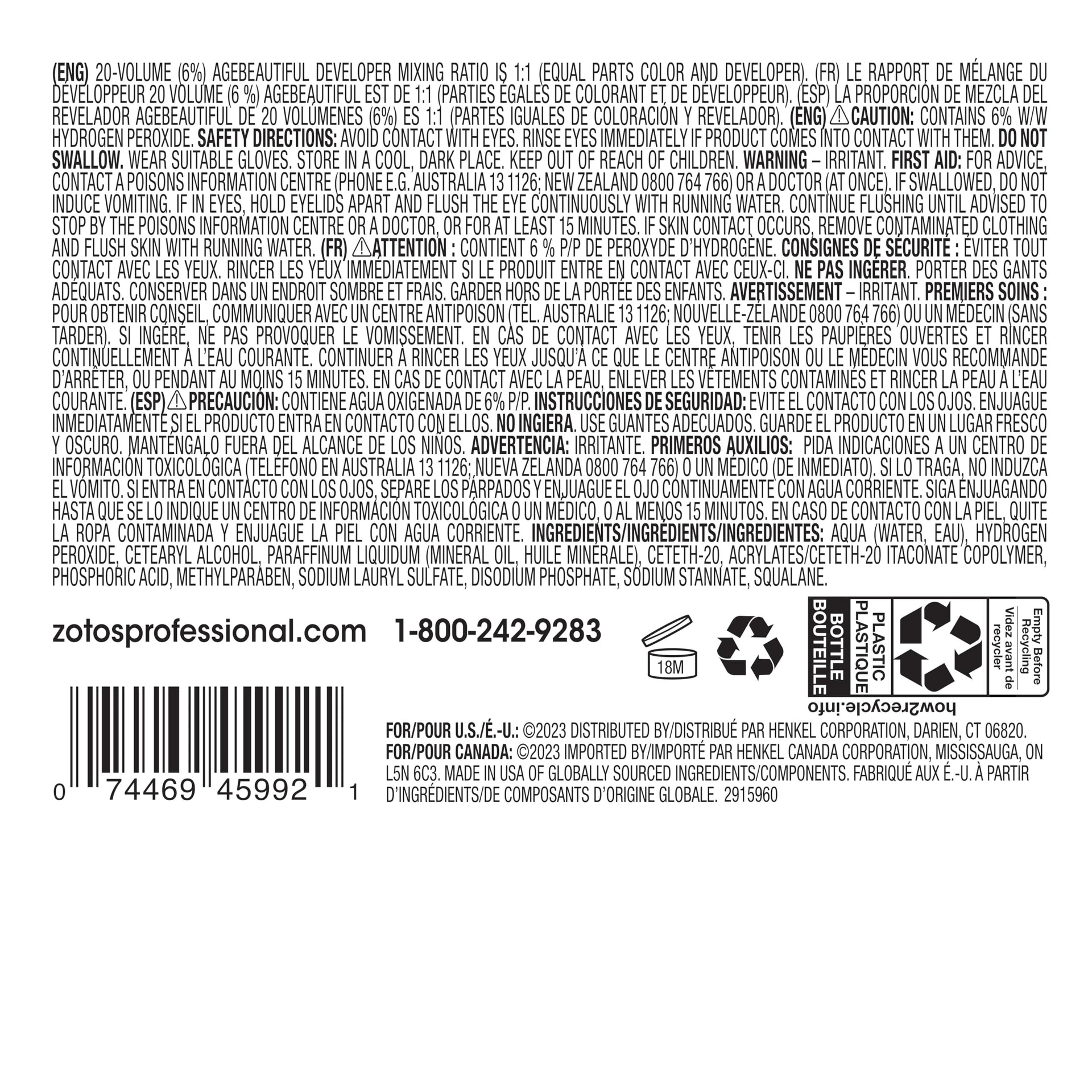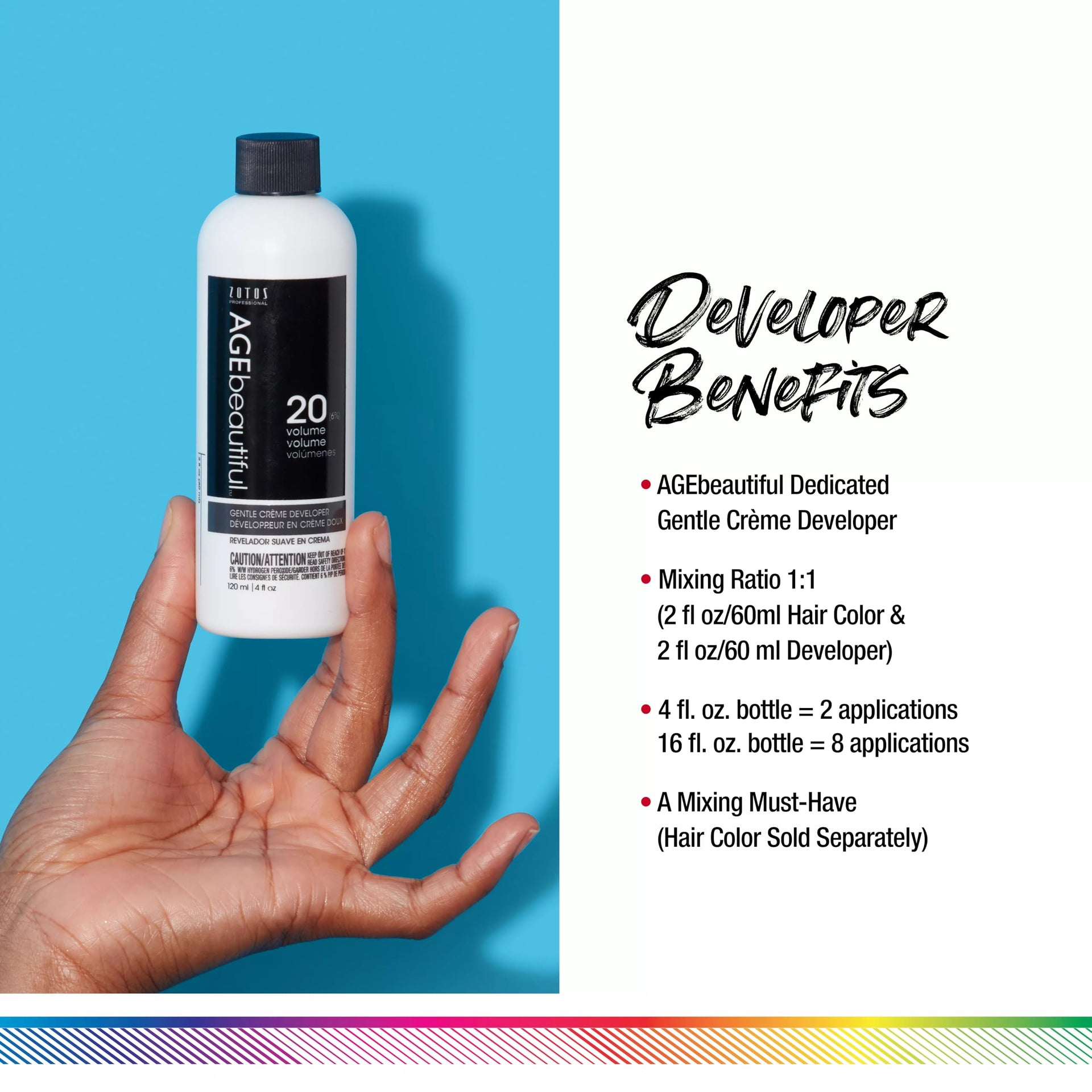 - AGEbeautiful 20 Volume Gentle Crème Developer lifts hair up to 2 levels when coloring. 20 Volume Developer is a good choice for most AGEbeautiful Liqui-Crème shades.