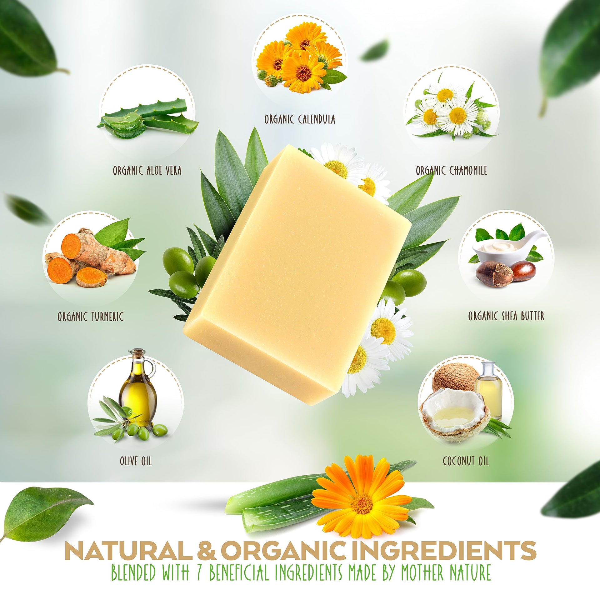 - Ingredients: Organic Sustainable Palm Oil, Organic Aloe Vera Juice, Organic Shea Butter, Coconut Oil, Organic Sunflower Oil, Organic Calendula Extract, Organic Turmeric Extract, Organic Chamomile Extract, Organic Olive Oil, Organic Castor Oil, Kaolin Clay, Lemongrass Essential Oil, Cananga Essential Oil, Sodium Hydroxide (key element to making soap, none remains in finished product).