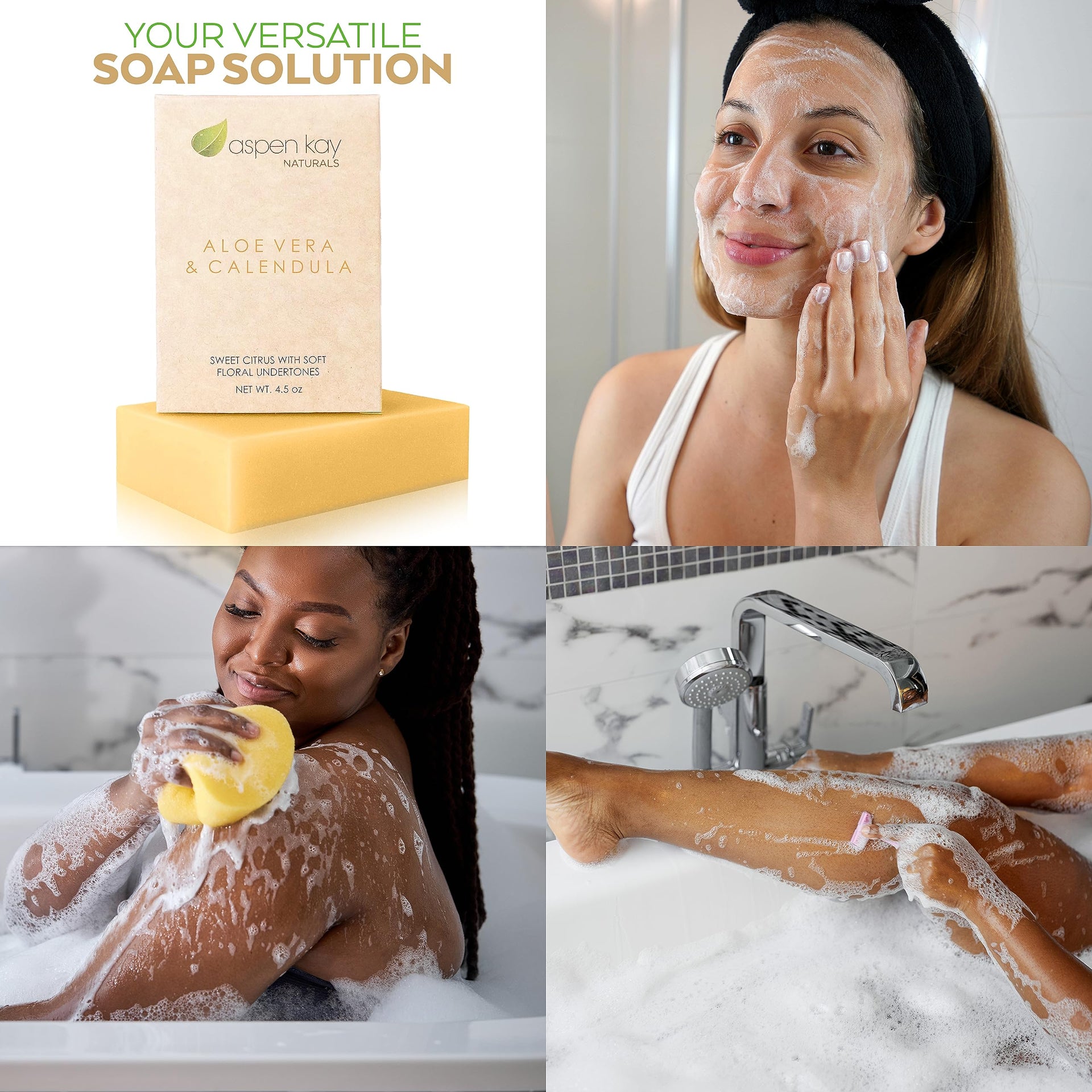 - Our Aspen Kay Naturals Calendula & Aloe Soap is made the old fashioned way using the cold process method. Made with organic aloe vera juice, organic calendula, organic chamomile and naturally colored with organic turmeric. Lightly scented with pure essential oils to give this soap a light lemon blossom scent.
