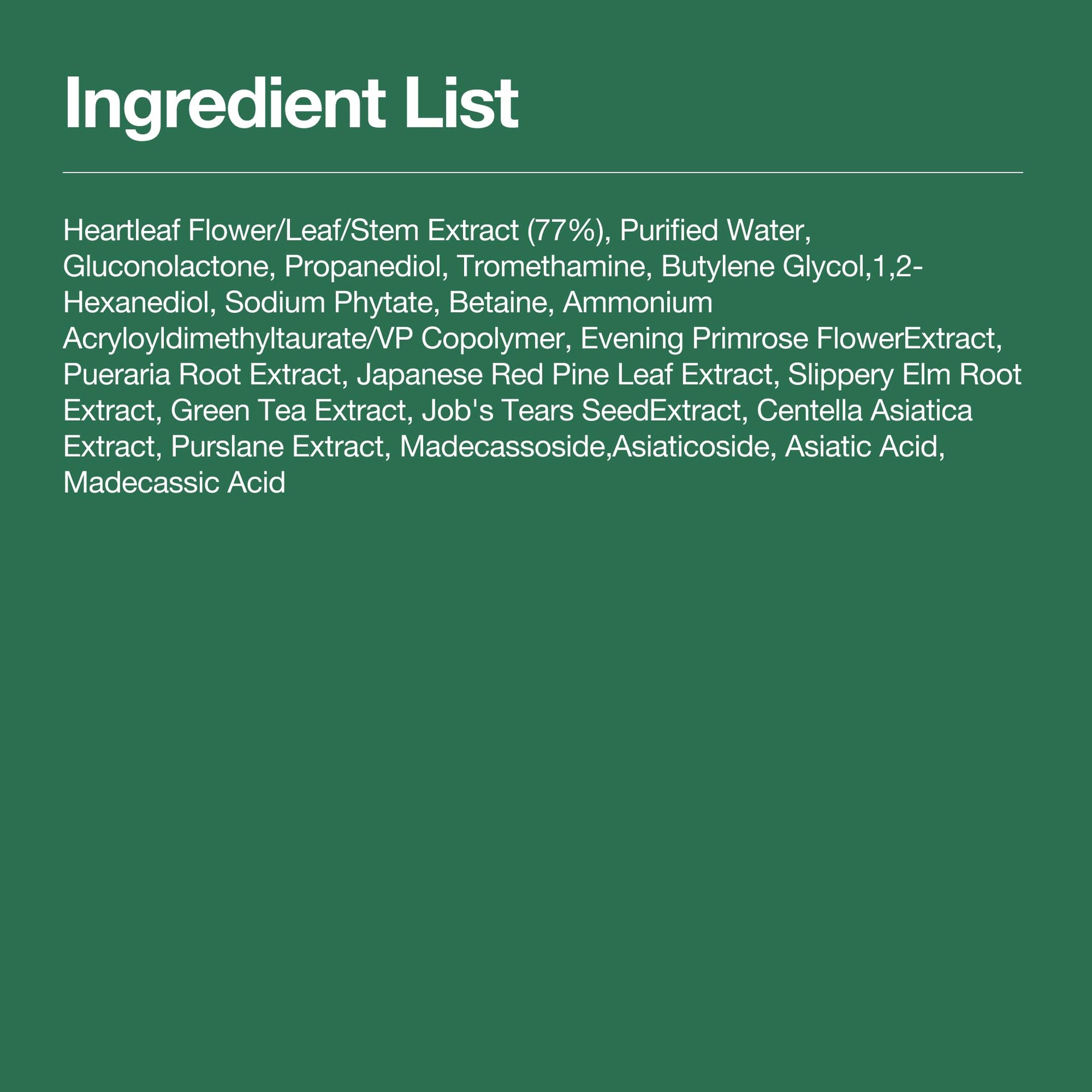 - FORMULATED WITH NATURAL INGREDIENTS Contains 77% Heartleaf Extract, Hypoallergenic and ideal for sensitive skin, this extract helps soothe irritation while providing benefits in a hydrating, non-sticky texture