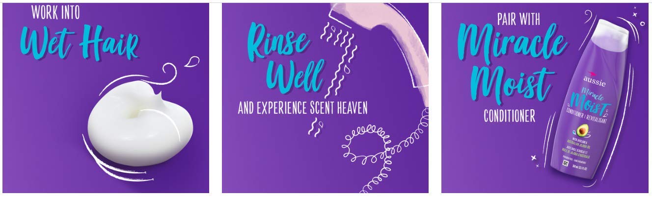 Details: MORE MOISTURE. LESS THIRST. It’s easy to treat your tresses to a little extra hydration with Aussie Miracle Moist Conditioner. Infused with avocado and jojoba seed oil, this ultra-rich conditioner transforms your hair from dry and thirsty to quenched and carefree. Smooth it on strands after shampooing to unlock slip-through-your-fingers softness and a superb scent. END YOUR DRY SPELL. Aussie Miracle Moist Shampoo soaks your strands in mega-hydration. Infused with avocado and jojoba seed oil, this fabulously rich shampoo transforms dry, thirsty hair with out-of-this-world hydration while leaving you with the delightfully fun scent of luscious citrus.