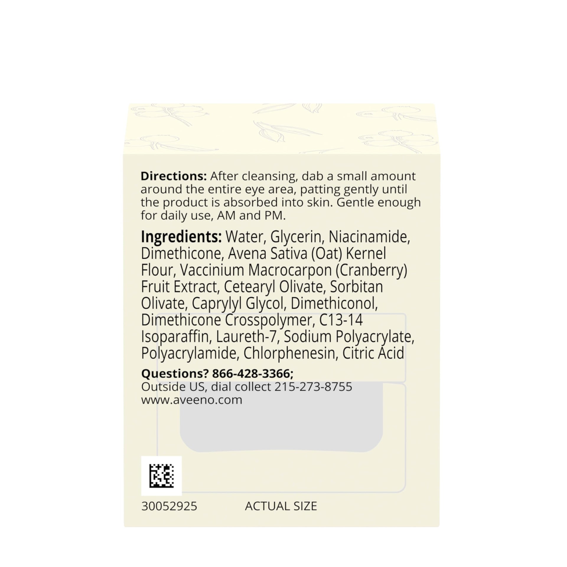 Details: Visibly improve the look of wrinkles and crow's feet with Aveeno Calm + Restore Age Renewal Eye Gel. This anti-aging eye cream from a dermatologist-recommended skincare brand for over 70 years works to improve the appearance of wrinkles, crow's feet, puffiness, and dark circles without redness or sensitivity. The nourishing under-eye cream contains cranberry extract, a gentle, plant-based retinol alternative with antioxidant-rich peptides clinically proven to reduce signs of aging. Proven to visibly improve the look of wrinkles and puffiness in just one week, the firming eye cream also contains oat and niacinamide (Vitamin B3). Proven gentle and safe when tested on sensitive skin, the hypoallergenic, hydrating eye gel is fragrance-free, paraben-free, phthalate-free, dye-free, alcohol-free, and non-comedogenic. After cleansing, dab a small amount of anti-aging eye gel around the entire eye as a part of your daily skincare routine.