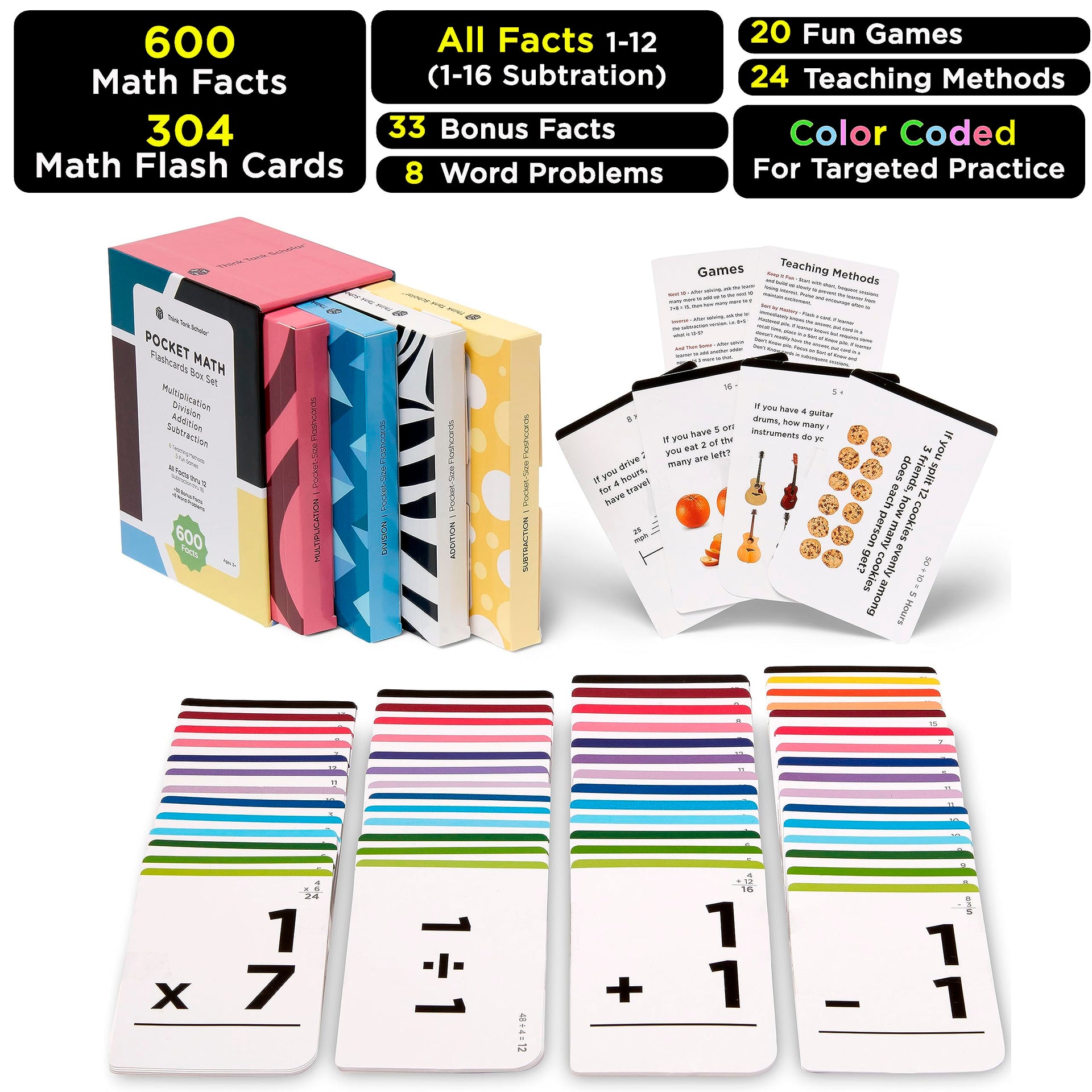 - ✅ 600 Facts Math Flash Cards (Addition, Subtraction, Multiplication, Division) for First Grade / Second Grade / Third Grade / Fourth Grade / Fifth Grade / Sixth Graders learning all facts 1-12 for addition, multiplication, division and 1-16 for subtraction, +33 bonus facts and 8 word problems. Comes with twenty four (24) teaching methods and twenty (20) fun learning games.