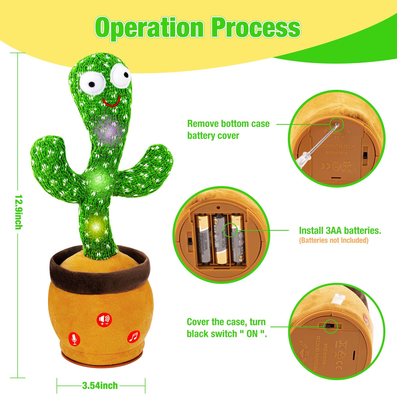 - SINGING CACTUS TOY - Uses non-toxic, ultra-soft plush; meets strict international kids’ safety standards (CPSIA, CPC, ASTM)—you can rest easy. Plastic base ensures steady table placement, and cleaning’s simple: just a damp cloth wipe