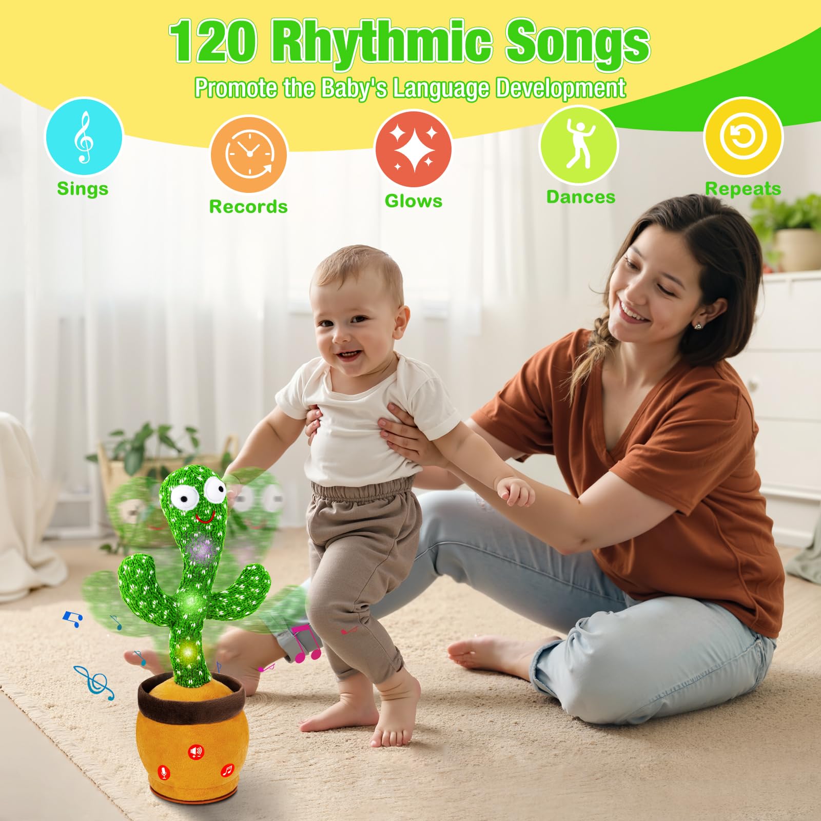 - DANCING AND TALKING CACTUS TOY - Upbeat music aids auditory development, lively movements help visual training. This baby toy even gets babies to lift heads during tummy time (builds that essential skill). Easy, fun, fits all babies & toddlers, any age/month