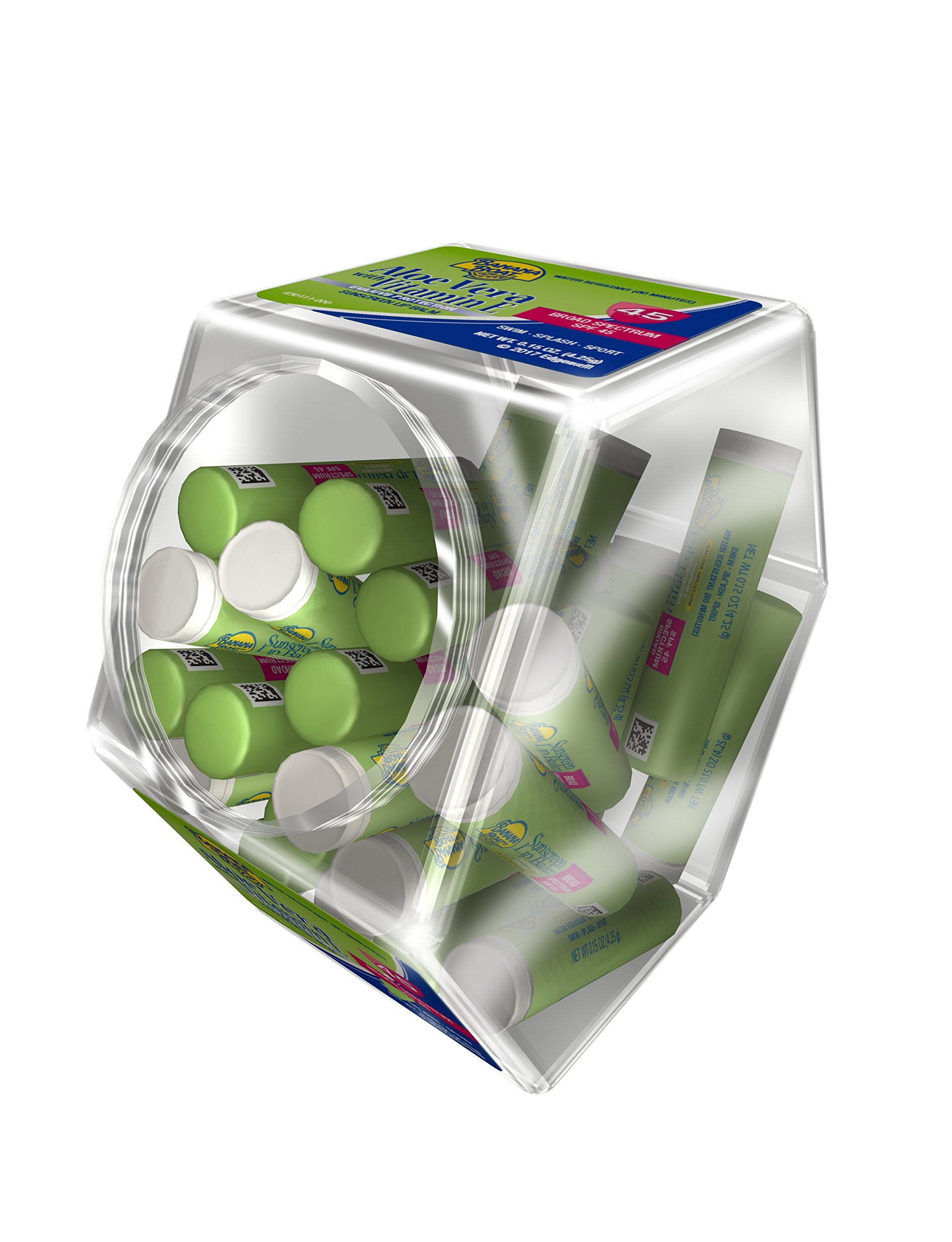 Details: Pucker up to soft and protected lips. Banana Boat Sunscreen Lip Balm SPF 45 with Aloe Vera & Vitamin E moisturizes, conditions, and protects sensitive lips with broad-spectrum UVA/UVB protection that lasts as long as the fun does*. Made with aloe vera & vitamin E, this lip balm with sunscreen is great for everyday use and is water resistant for up to 80 minutes. *Be sure to reapply as directed on the product label.