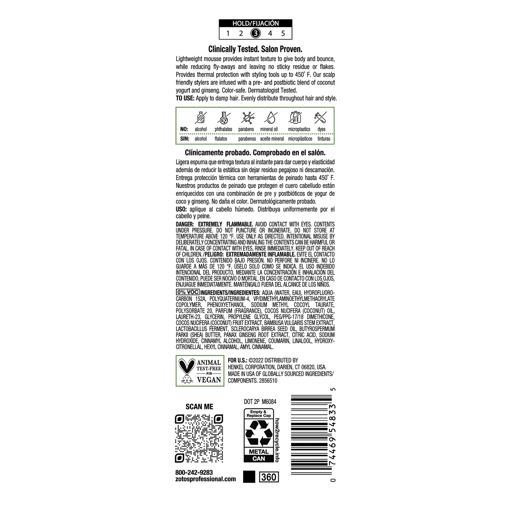 Details: Clinically Tested. Salon Proven. Lightweight mousse provides instant texture to give body and bounce, while reducing fly-aways and leaving no sticky residue or flakes. Provides thermal protection with styling tools up to 450˚ F. Our scalp friendly stylers are infused with a pre- and postbiotic blend of coconut yogurt and ginseng. Color-safe. Dermatologist Tested.