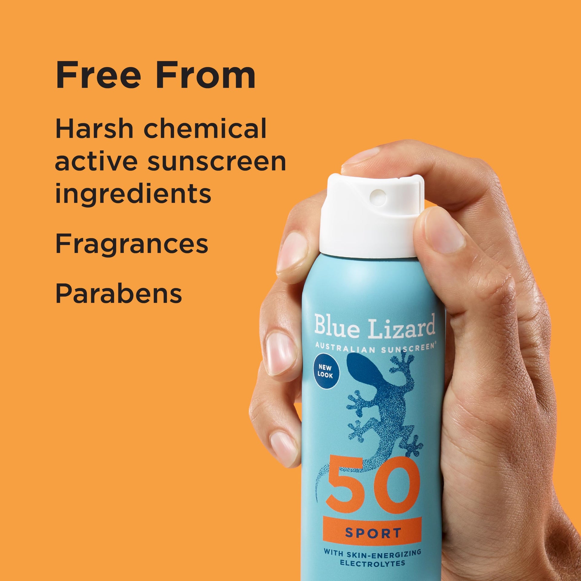 Details: Blue Lizard Sport Mineral Spray Sunscreen offers serious sun protection for athletes in a convenient spray. Blue Lizard is dermatologist-recommended, and this broad-spectrum UVA/UVB SPF 50+ protects your skin from 98% of UVB rays so you can enjoy your outdoor adventures. It's designed to stand up to any outdoor activity. Spray and rub into skin for mineral sun protection that is easy to use and dries clear, so you don’t have to worry about your SPF showing. This adventure-ready spray is customer-tested to feel great on your skin. Blue Lizard spray sunscreens are enriched with skin nourishing ingredients, which leave your skin feeling smooth and not sticky. Our Sport Spray Sunscreen works as hard as you with 80 minutes of water resistance, so your skin stays protected longer. Our formula is Zinc Oxide-based, so it provides broad-spectrum protection without chemical active ingredients or airborne Titanium Dioxide. It’s a vegan formula, free from Parabens, Fragrances, Phthalates, and drying alcohols, making it ideal for all skin types, including sensitive skin . We Love the Reef: This sunscreen is made without Oxybenzone or Octinoxate to help protect fragile reef ecosystems. The propellant also has ultra-low global warming potential (GWP).This sunscreen helps prevent sunburn and photo damage caused by UVA/UVB exposure. Higher SPF gives more sunburn protection. If used as directed with other sun protection measures (see Directions), decreases the risk of skin cancer and early skin aging caused by the sun Directions: Shake well before and frequently during use. Apply liberally 15 minutes before sun exposure. Hold container 4 to 6 inches from the skin to apply. Do not spray directly into face. Spray on hands then apply to face. Do not apply in windy conditions. Use in a well-ventilated area and avoid inhalation. Children under 6 months of age: Ask a doctor. Sun protection measures: Spending time in the sun increases your risk of skin cancer and early skin aging. To decrease this risk, regularly use sunscreen with a broad spectrum SPF value of 15 or higher and other sun protection measures including: Limiting time in the sun, especially from 10 a.m. to 2 p.m., wearing long-sleeved shirts, pants, hats, and sunglasses. When to reapply: After 80 minutes of swimming or sweating; immediately after towel drying; at least every 2 hours. Go Have Fun. We’ll Take Care of the Sun. Dermatologists have trusted Blue Lizard Australian Sunscreen for over 20 years, so you can have the peace of mind that your skin is protected.