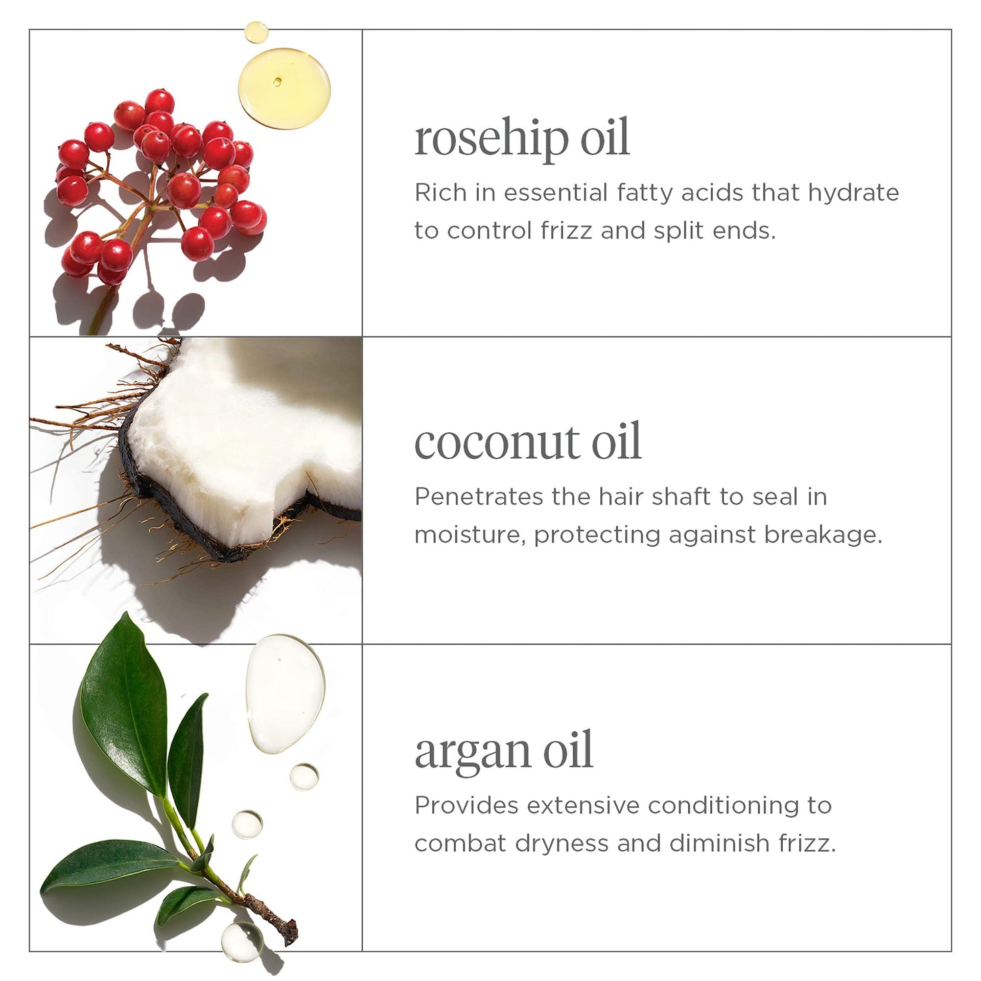 - NATURALLY POWERED INGREDIENTS: Rosehip oil provides essential fatty acids that lock in moisture and help prevent frizz. Argan oil conditions hair and helps minimize dryness and frizz. Coconut oil seals in moisture and helps protect against breakage and heat. Vitamin E moisturizes hair and helps protect against free radical damage.