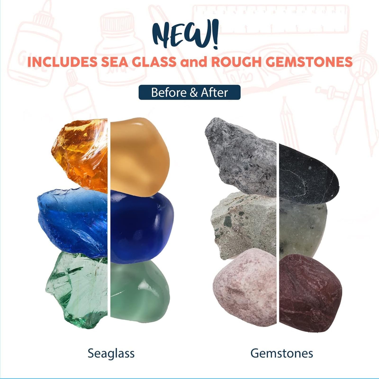 - NO AGE LIMIT ON OUR ROCK-VENTURE: our rock polishing kit also seamlessly fits as a staple among rock tumblers for adults. The quality and performance are professional grade, meeting the standards of adult geology & mineralogy enthusiasts. Turn this hobby into a fun learning journey. The rock tumbler kit includes rock tumbler machine, low-noise barrel, 4 grit packets, assorted rough sea glass and gemstones, mesh strainer, spare tumbler belt, and an instructions & learning guide booklet
