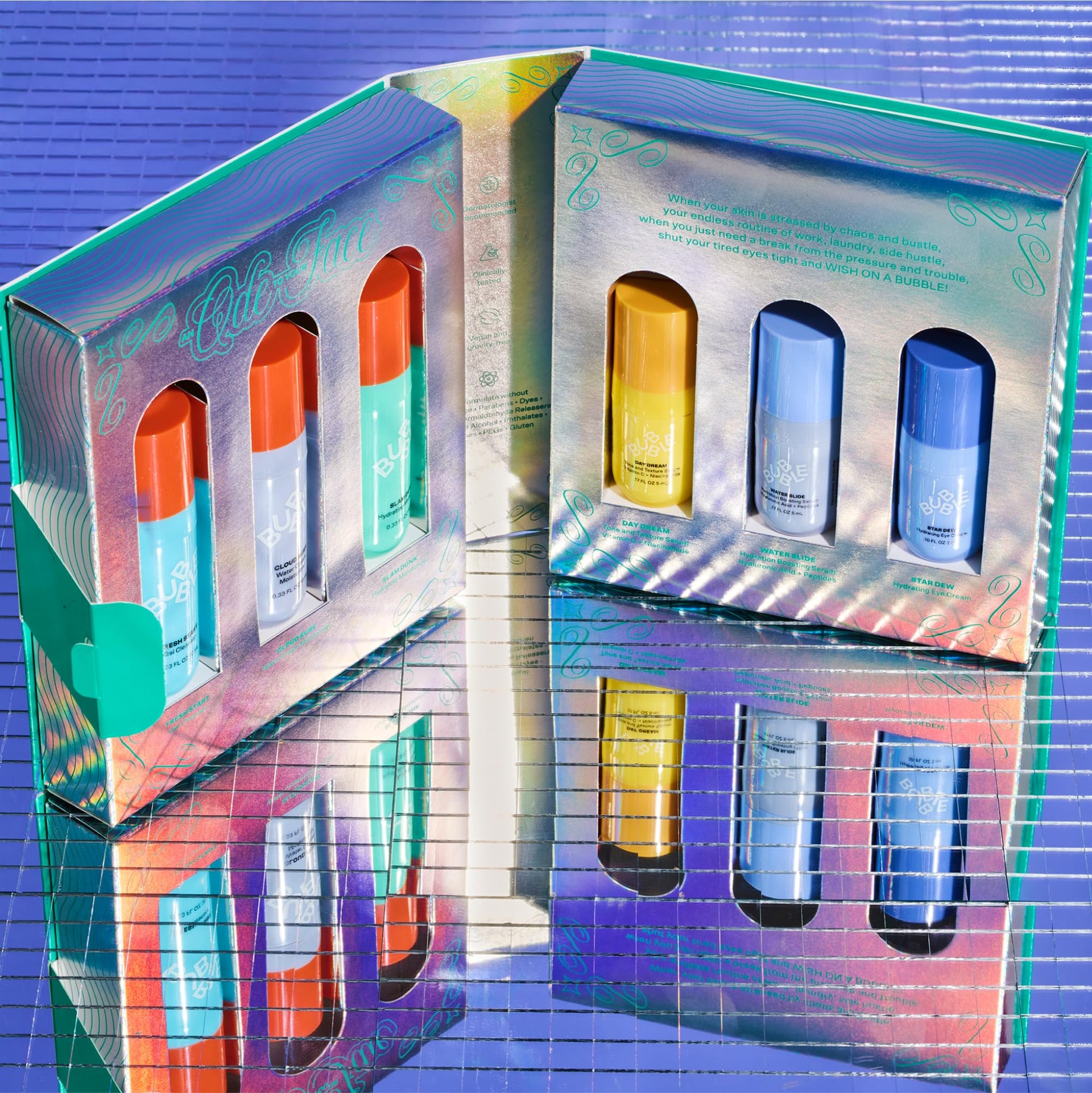 Details: Say hey to your new skincare starter pack: the Bubble The Wish List Mini Skincare Essentials Gift Set is a 6-step dream routine in travel-friendly sizes, perfect for trying, gifting, or glowing on the go. Start with Fresh Start, our gentle gel cleanser that clears the grime without the drama. Next up: Day Dream, a glow-up in a bottle with Vitamin C and Niacinamide to even tone and bring the brightness. Water Slide dives deep with Hyaluronic Acid and peptides to hydrate and strengthen your barrier without the sticky feel. Tired eyes? Star Dew brings the bounce back, with squalane, shea butter, and peptides to smooth, de-puff your under-eyes. Then there’s Cloud Surf, the floofy water cream that rebalances oil, minimizes pores, and plays nice under makeup. Finally, Slam Dunk seals it all in with a creamy dose of hydration, blue light defense, and serious skin-soothing energy. Everything’s vegan, dermatologist-tested, cruelty-free, and made for all skin types, even sensitive. Glow wherever you go with this complete, mini-sized Bubble routine.