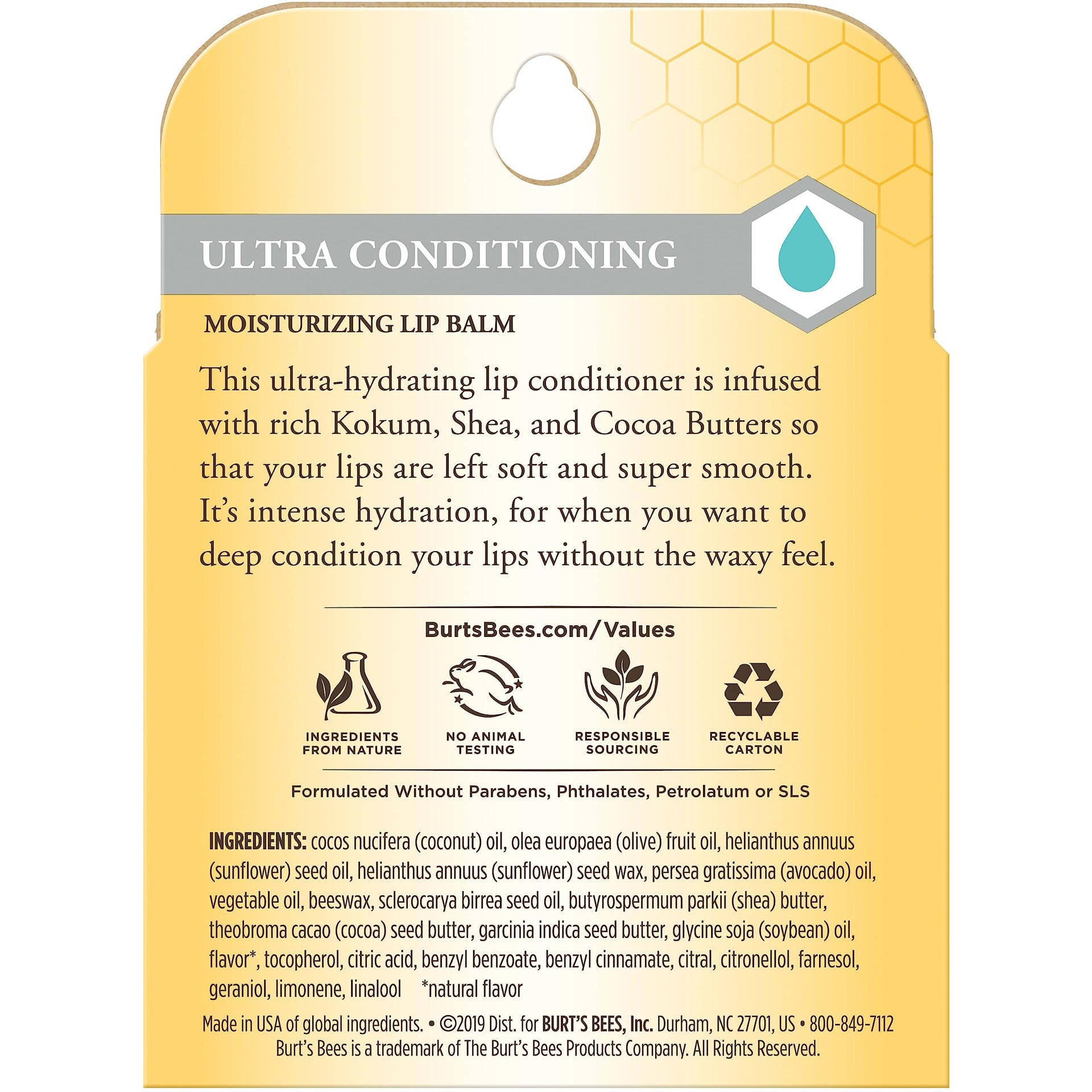 - ULTRA CONDITIONING LIP BALM: One package contains four 0.15 oz. lip balm tubes of Burt’s Bees Ultra Conditioning Moisturizing Lip Balm to hydrate and condition dry lips