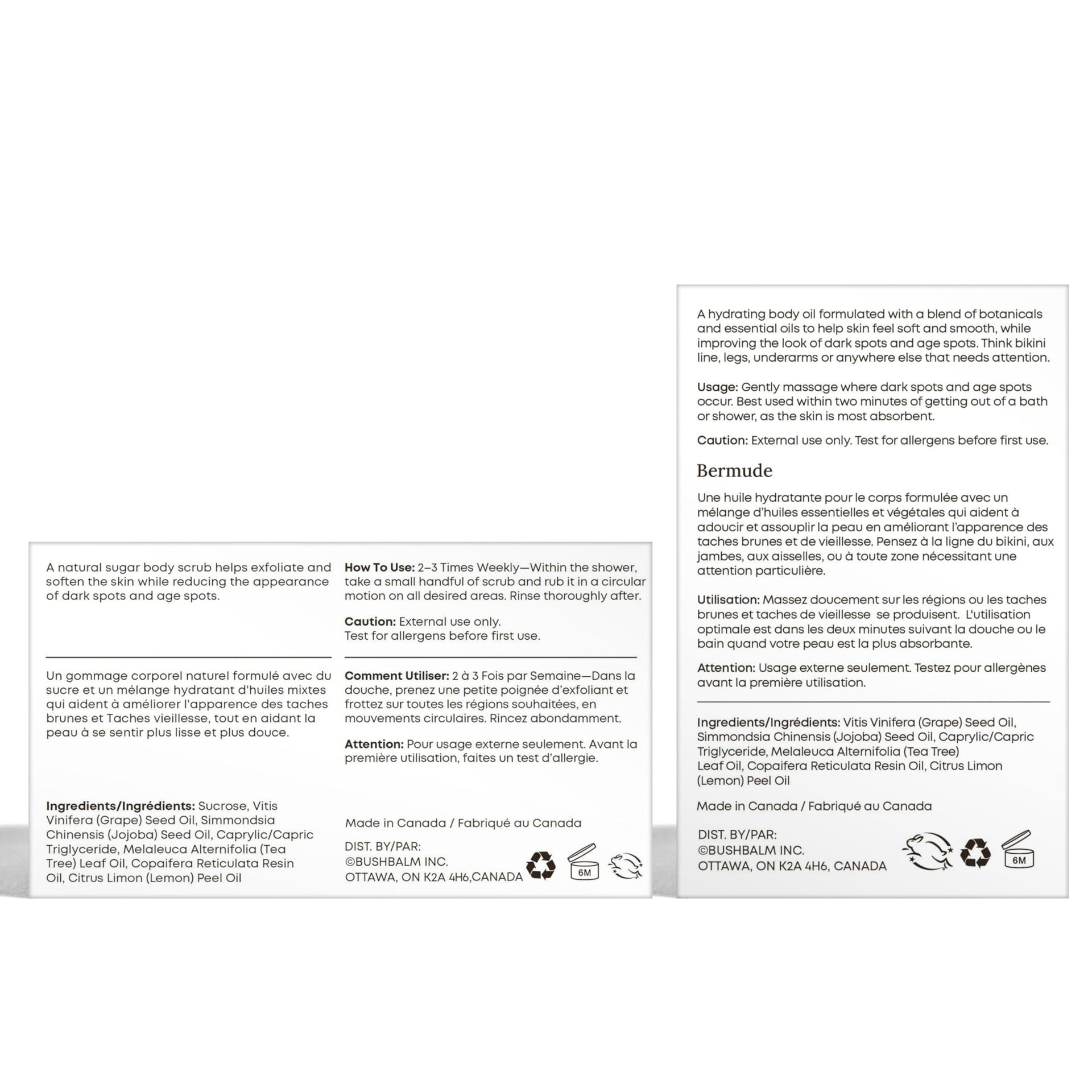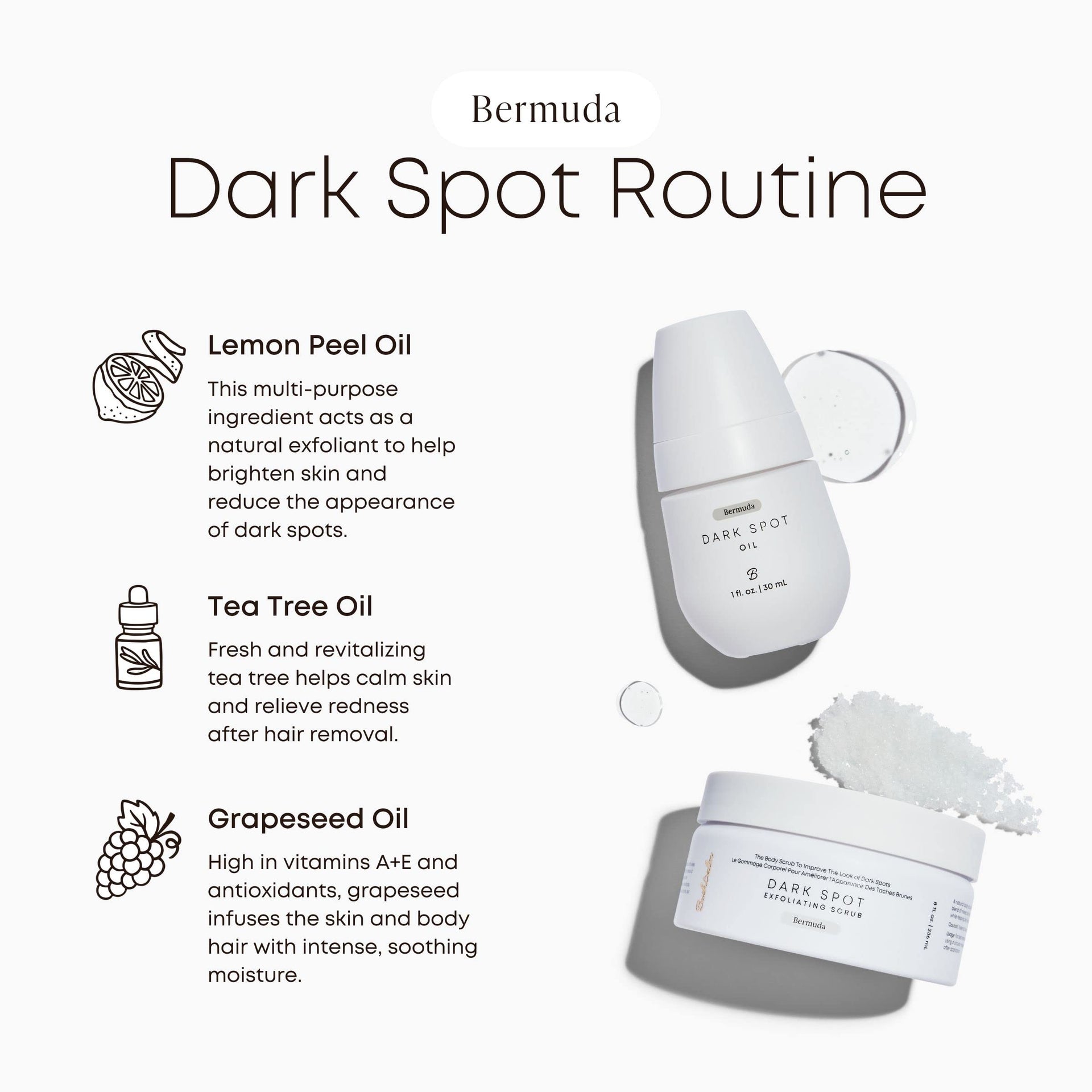 - What’s Included: This skincare bundle includes one full-sized Bermuda Dark Spot Oil (30 ml) and one full-sized Bermuda Dark Spot Exfoliating Scrub (236 ml). Bermuda has a soft refreshing scent that will make you feel like you are in paradise, with a hint of lemon.