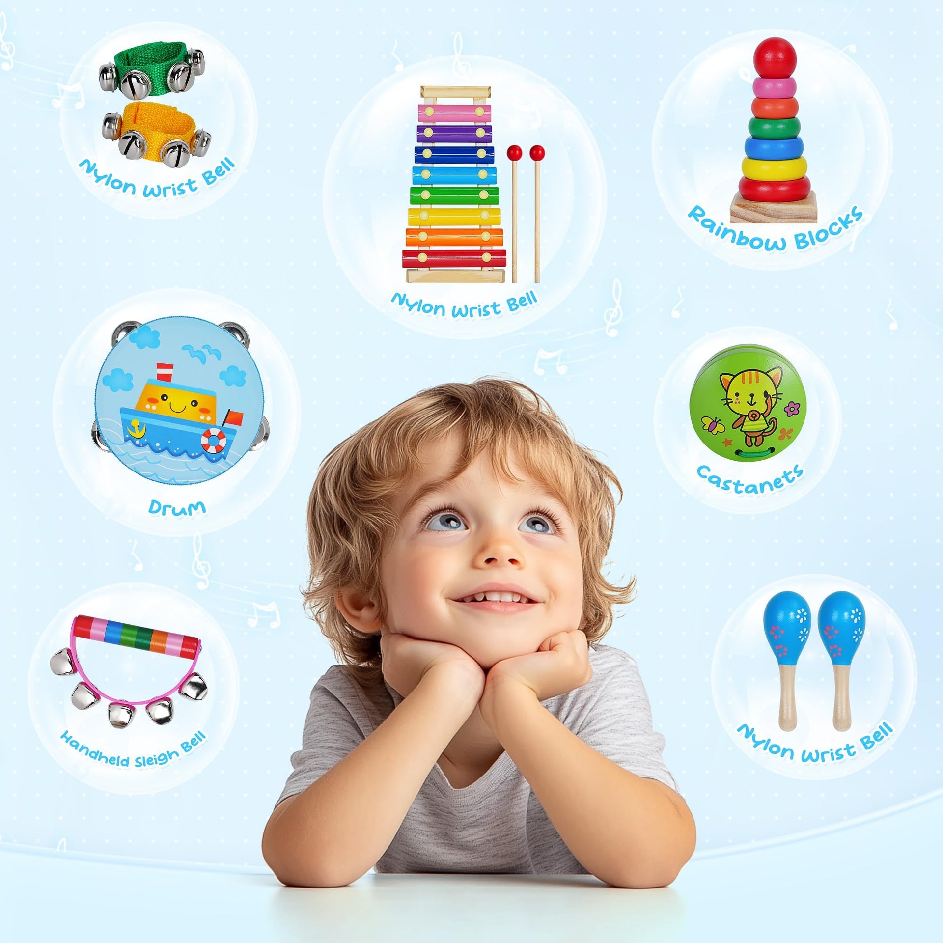 - Gift Idea For Kids Package Include:1 x Xylophone,2 x Maracas,2 x Nylon Wrist Bell,1 x Handheld Sleigh Bells 5 Large Bells,1 x Castanets,1 x Rainbow Blocks,1 x Drum,2 x Xylophone Mallets,1 x Carrying bag