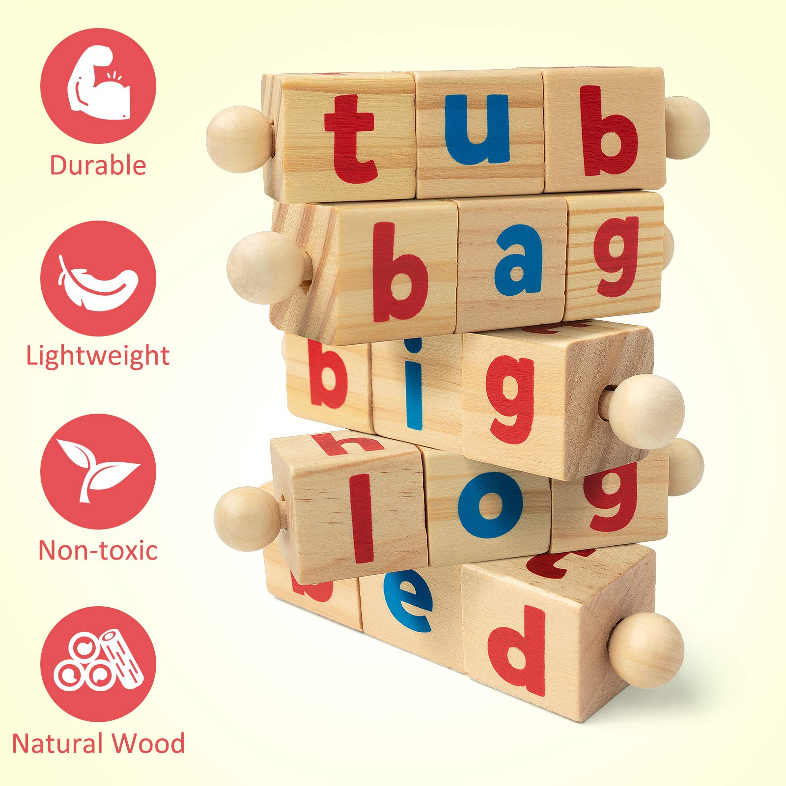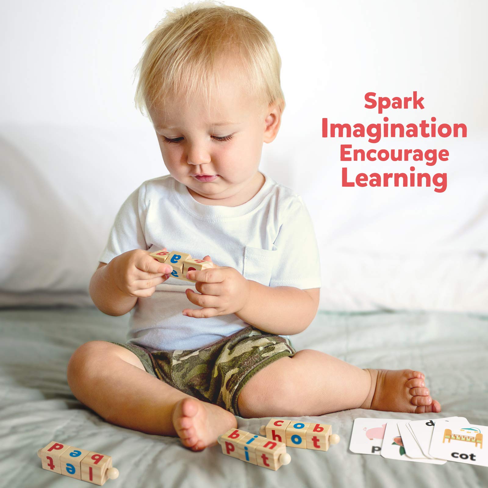 - Wooden Spelling Toy: Includes a wood tray, 5 Handheld Sets of Rotating Blocks with 3-letter word movable blocks. Along with 48pcs site words flash card (24 pcs foldable word 2-in-1 cards, 24 pcs word cards). Appropriate for teaching very basic reading skills.