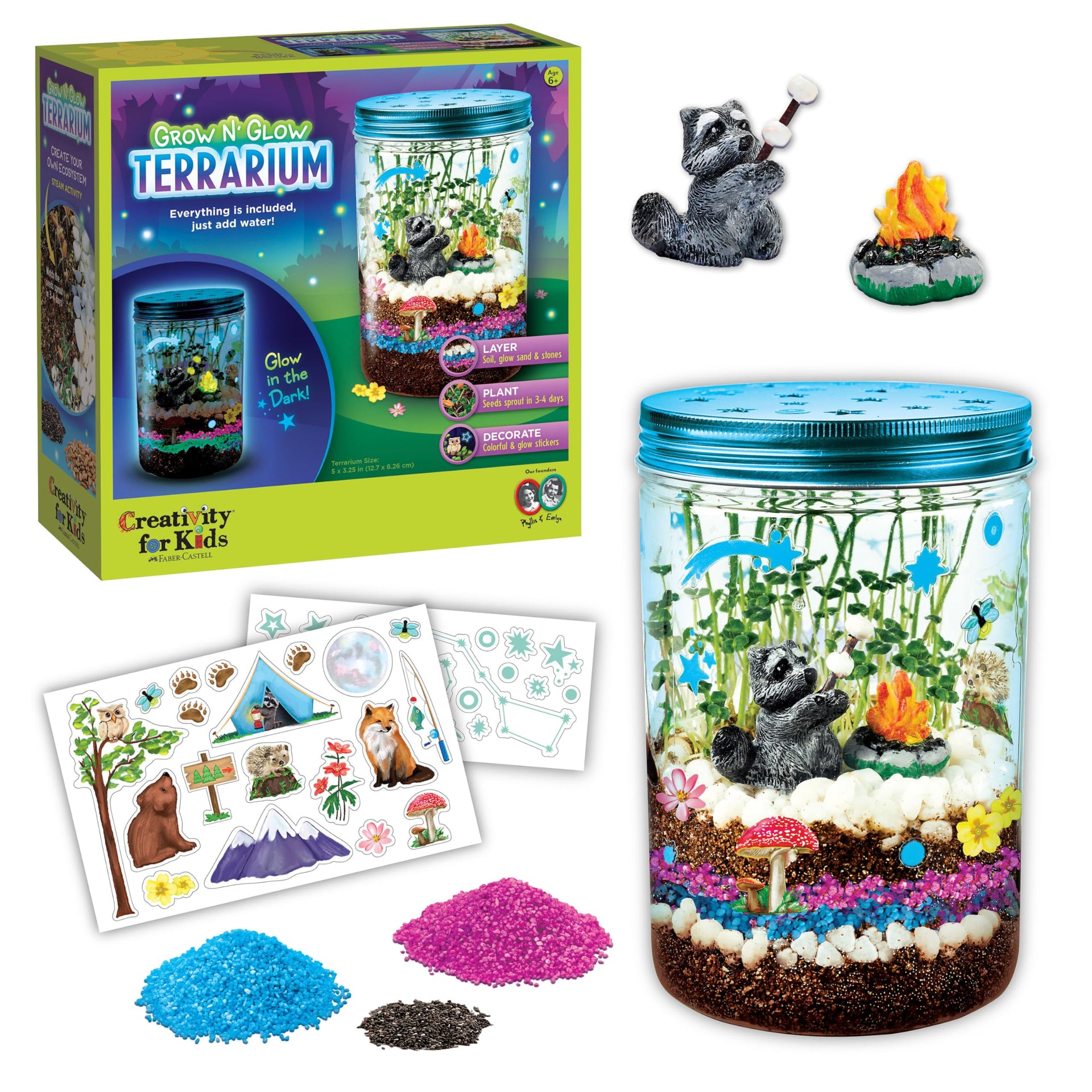 Discover the world of science by creating your own mini ecosystem with this terrarium kit for kids! The Grow N’ Glow Terrarium is a complete science kit for kids ages 6-8+ to explore and create their very own miniature eco-system. It’s easy and comes with everything you need to decorate and complete a Grow N’ Glow Terrarium Kit with two plant life cycles. Inside the discovery kit for kids, you will find a plastic jar, a decorative lid, potting soil, USA organic chia and wheatgrass seeds, garden figurines, glowing sand, river stones, stickers, and more! You just assemble, decorate, water, and watch it grow! Kids will love to see how things work and especially how the magic of seeds, soil, sun, and water will blossom into green plants! This science kit also encourages independence and screen-free play. The STEM project for kids ages 6-8+, indoor activity allows you to craft, plant, water, and grow your own mini ecosystem. Just add water for a unique science experience! Using the educational science kit is a unique way to unplug, unwind and have fun while learning. This science kit for kids is a great project for homeschoolers working on a botany unit, or for anyone who’d like to have a sweet little decorative terrarium by day and a glow-house by night! Everything you need in this educational set is included for 2 full planting life-cycles, so you can plant your terrarium and watch it grow, then do it all again in a month or so, depending upon how long your plants thrive. Kids science and craft activities are great gifts for 6 year old boys and girls. After assembling there are forest-themed stickers, glow-in-the-dark constellations, and star stickers to embellish your terrarium further. During the day, when the terrarium is in full light, it soaks up light for the plants and in the glow stickers to make them shine at night. This arts and crafts for kids ages 6+ will allow boys and girls to enjoy using their creative side to build and construct their own glow-in-the-dark terrarium kit and watch it grow in a few short days! A world of discovery awaits! This creative and nurturing craft for kids makes the perfect 7 year old boy and girl gift! Since 1976, Creativity for Kids has proudly created fun and creative experiences to nurture kids confidence for life. The Grow ‘N Glow Terrarium Kit is recommended for girls and boys ages 6-8+.